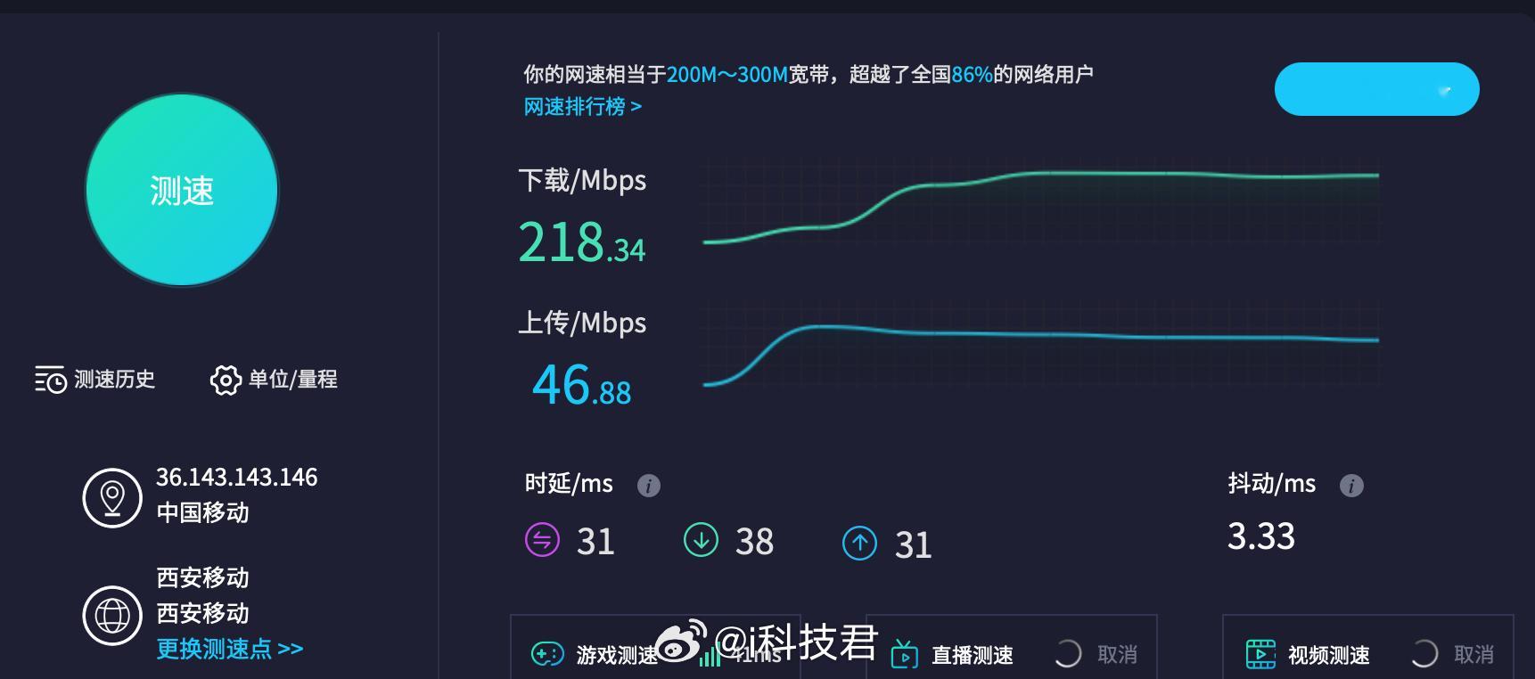 移动宽带200兆,配个150块钱的Wi-Fi 6路由器,随随便便网速都能跑满路由器只穿一堵墙的话,一般家庭网速都能满足的