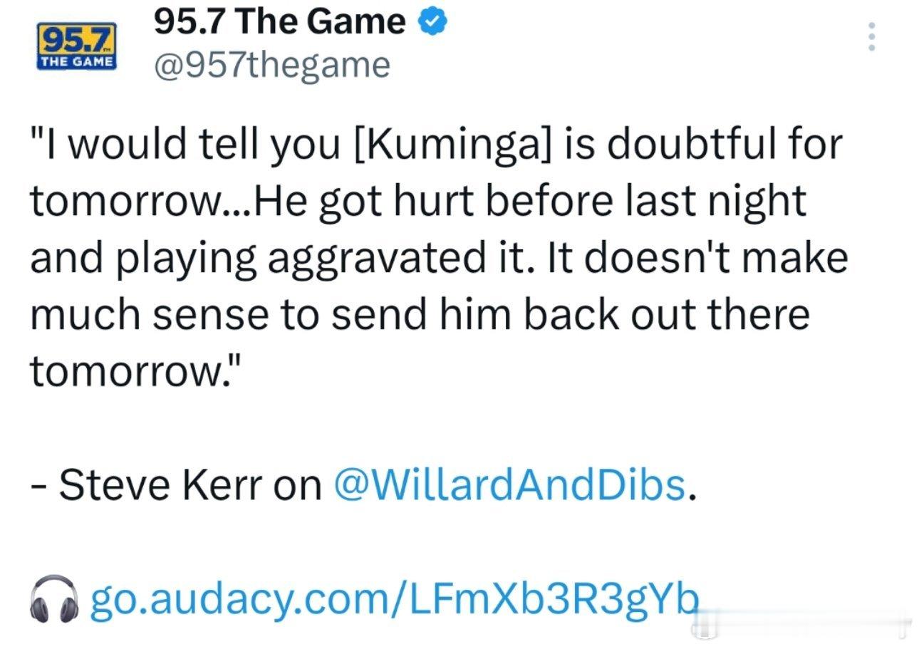 库明加出战存疑,明日大概率不打。科尔称,库明加昨日比赛中伤势加重,因此明日上场意义不大。