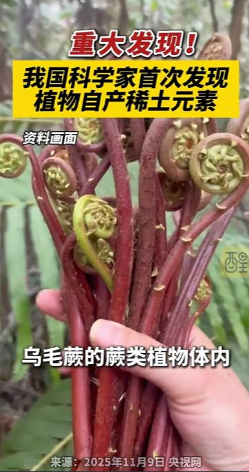 国运来了挡都挡不住!平时随处可见的乌毛蕨,被我国科研人员一研究,直接炸出世界级大发现 —— 这玩意儿不仅能 “吸” 稀土,还能让稀土在自己体内 “搭积木”,自动组装成 “镧独居石” 矿物!谁能想到路边不起眼的野草,竟藏着 “稀土金矿”,这不是国运来了是什么? 最近网上有个事儿吵翻了,有人调侃说,以后见了路边的野草得客气点,也有人说这根本就不是野草而是镶了金边的。 可令大家意想不到的时候,人们调侃的不是啥名贵植物,就是南方山上随处可见的乌毛蕨,以前谁都没把它当回事,现在却因为科研团队的研究,成了世界级的 “明星”。 咱们先说说这乌毛蕨有多普通,南方朋友上山下乡,随便找个阴湿的地方就能看着它,耐贫瘠、不挑环境,长得也没啥特别,一直被当成不起眼的野草。 谁能料到,就是这么个 “路人甲” 植物,藏着天大的本事。 事情还得从稀土矿区说起,那时候科研人员考察期间,意外留意到一奇特现象,乌毛蕨根系周边土壤的稀土含量极为稳定,且此植物似有“抓”住金属之能,着实令人称奇。 这一发现激起了团队的兴趣,他们即刻展开系统采样,深入分析其组织结构,探究离子吸附机制,随着研究推进,惊喜不断,原来,乌毛蕨体内竟藏着一套独特的“工作流程”。 它并非是直接从土壤里“汲取”轻稀土元素,还能在根部细胞内积聚、沉淀这些离子,更令人惊叹的是,它竟会对其进行“再加工”,此等能力着实超乎想象。 此外团队们还使用高分辨显微镜观察,看到稀土元素在植物体内,被蛋白引导着慢慢排列、聚到一起,最后变成了和天然稀土矿物差不多的 “镧独居石” 小晶体。 这种过程以前只在地质矿化里见过,现在居然在一株植物身上出现了。 咱们国家稀土多,但开采起来麻烦,处理矿石复杂,还得付出不少环境成本。要是乌毛蕨能实现 “绿色富集” 和 “体内矿化”,以后说不定能有全新的生物采集稀土方式。 现在科研人员已经在试着重人工栽培乌毛蕨,想提高它富集稀土的效率,还在研究怎么从它体内提取那些新形成的稀土矿物,争取做到低成本、低污染。 当然,乌毛蕨要真用到工业上,还有不少坎要过,富集效率够不够高、能不能规模化种植、提取工艺成熟不成熟,都得花时间验证。 但这次发现已经很有里程碑意义了,以后咱们利用资源,说不定能从 “挖矿” 变成 “种矿”,从破坏环境的开发,转向对环境友好的生物策略。 这些年国内科研团队一直在研究 “植物、矿物、环境” 的关系,在植物修复富集稀有金属这些方向上,已经有了不少突破。 乌毛蕨只是其中一个发现,它提醒咱们,大自然藏着的本事远超想象,这些本事正是现代科技和绿色发展最宝贵的资源。 那么通过这件事情告诉我们,真正的宝藏不一定在深山地底,可能就在咱们脚下的土地上,在身边那些看似普通的植被里。 当科技和自然结合到一起,很多以前觉得不可能的事,慢慢都能变成可能。 对此,你还有什么看法呢? (信息来源 :央视网 )