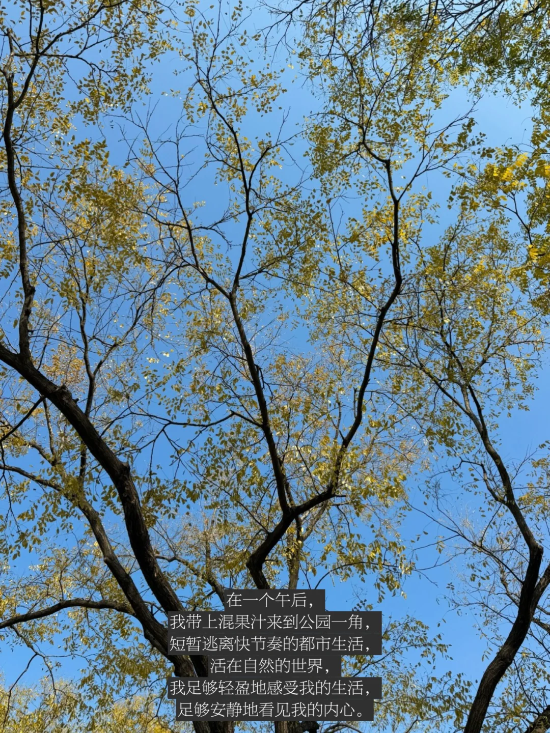 在一个午后,我带上混果汁来到公园一角,短暂逃离快节奏的都市生活,活在自然的世界,我足够轻盈地感受我的生活,足够安静地看见我的内心。