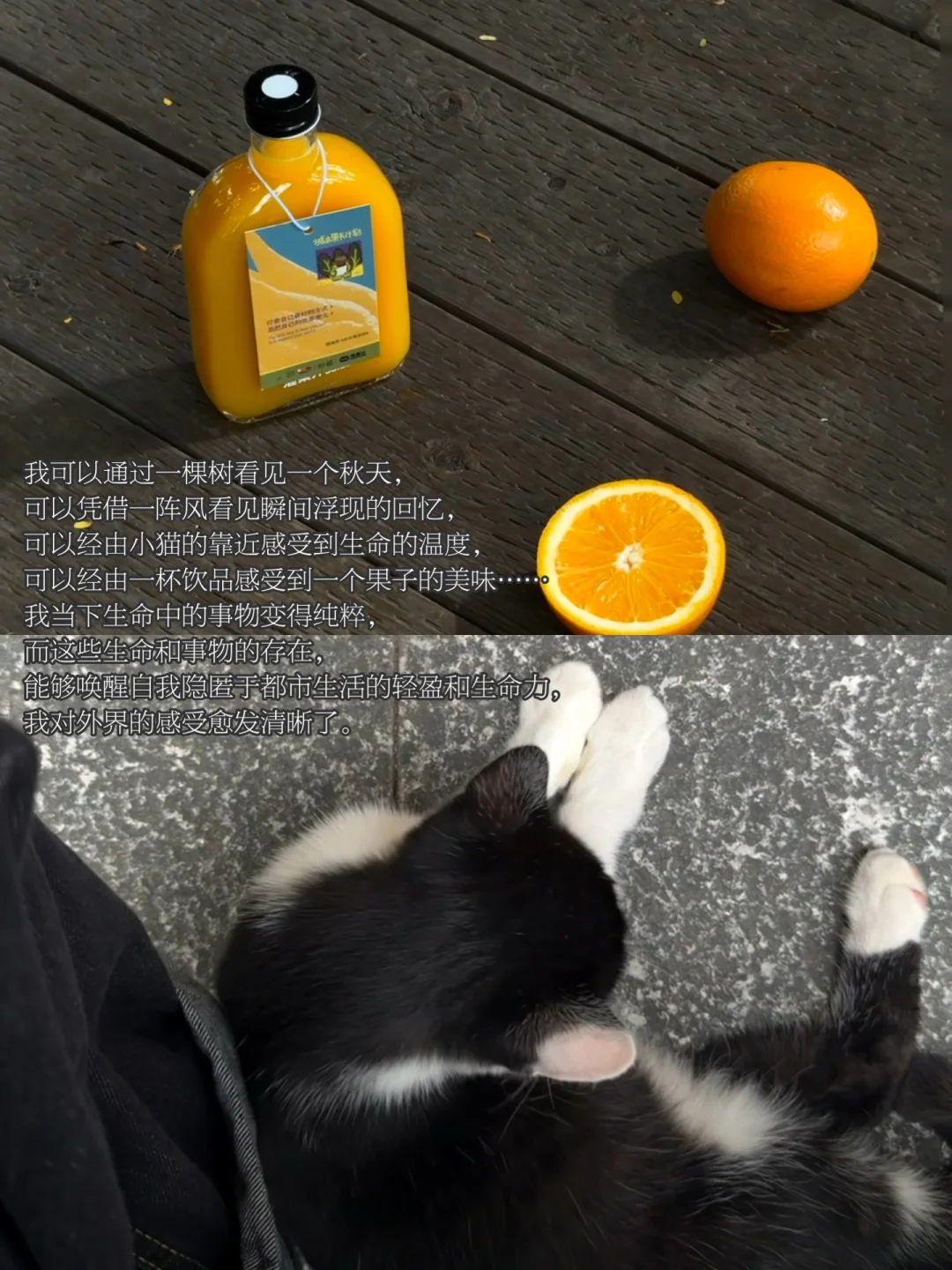 我可以通过一棵树看见一个秋天,可以凭借一阵风看见瞬间浮现的回忆,可以经由小猫的靠近感受到生命的温度……我当下生命中的事物变得纯粹,这些生命和事物悄然唤醒我隐匿于都市生活的轻盈和生命力。
