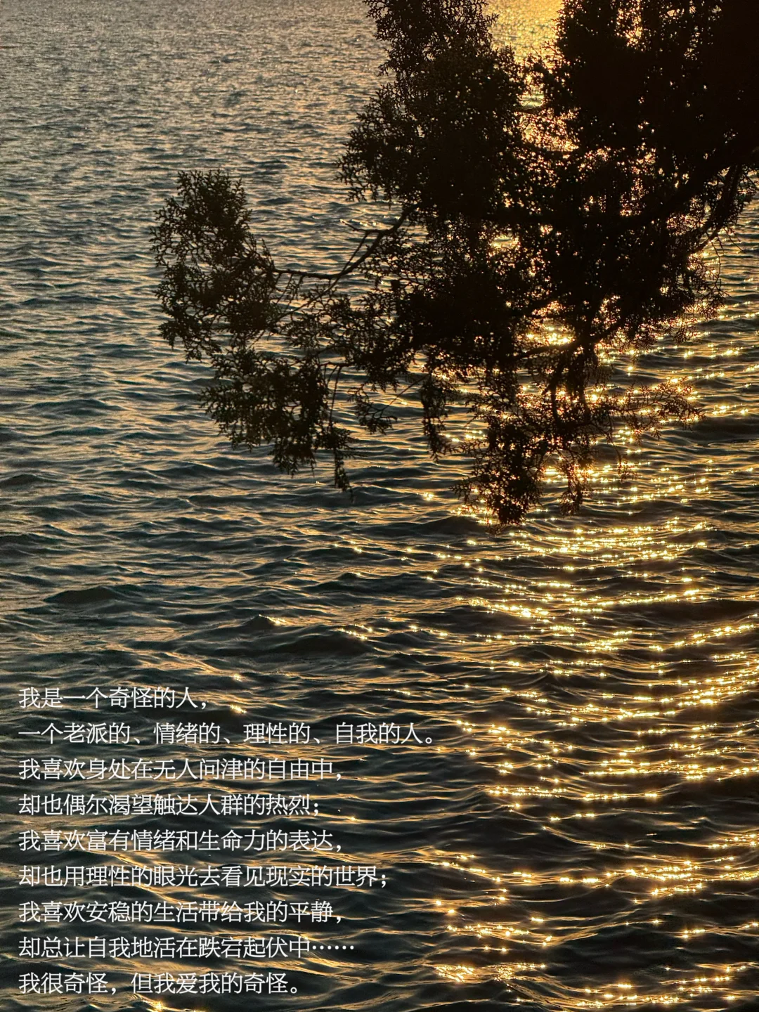 此刻,我具体而真实地触摸到内心的脉络。我是一个奇怪的人。我喜欢身处在无人问津的自由中,却也偶尔渴望触达人群的热烈;我喜欢富有情绪和生命力的表达,却也用理性的眼光去看见现实的世界;我喜欢安稳的生活带给我的平静,却总让自我地活在跌宕起伏中……我很奇怪,但我爱我的奇怪。