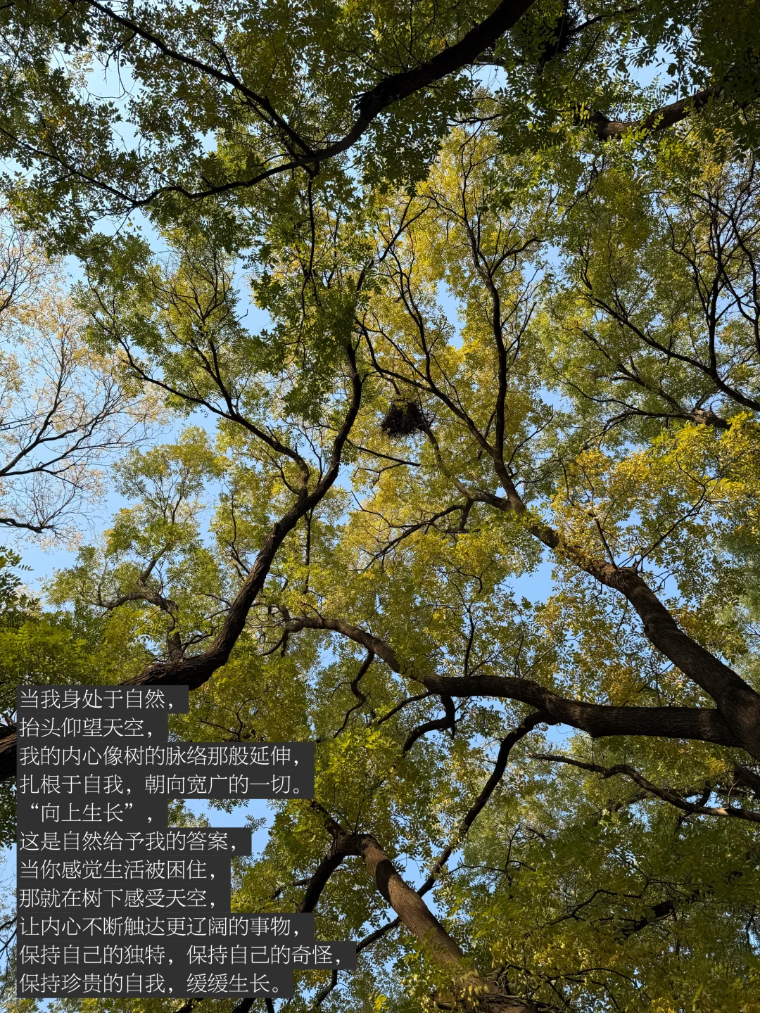 当我身处于自然,抬头仰望天空,我的内心像树的脉络那般延伸,扎根于自我,朝向宽广的一切,向上生长。这是自然给予我的答案,当你感觉生活被困住,那就在树下感受天空,让内心不断触达更辽阔的事物,保持自己的独特,保持自己的奇怪,保持珍贵的自我,缓缓生长。