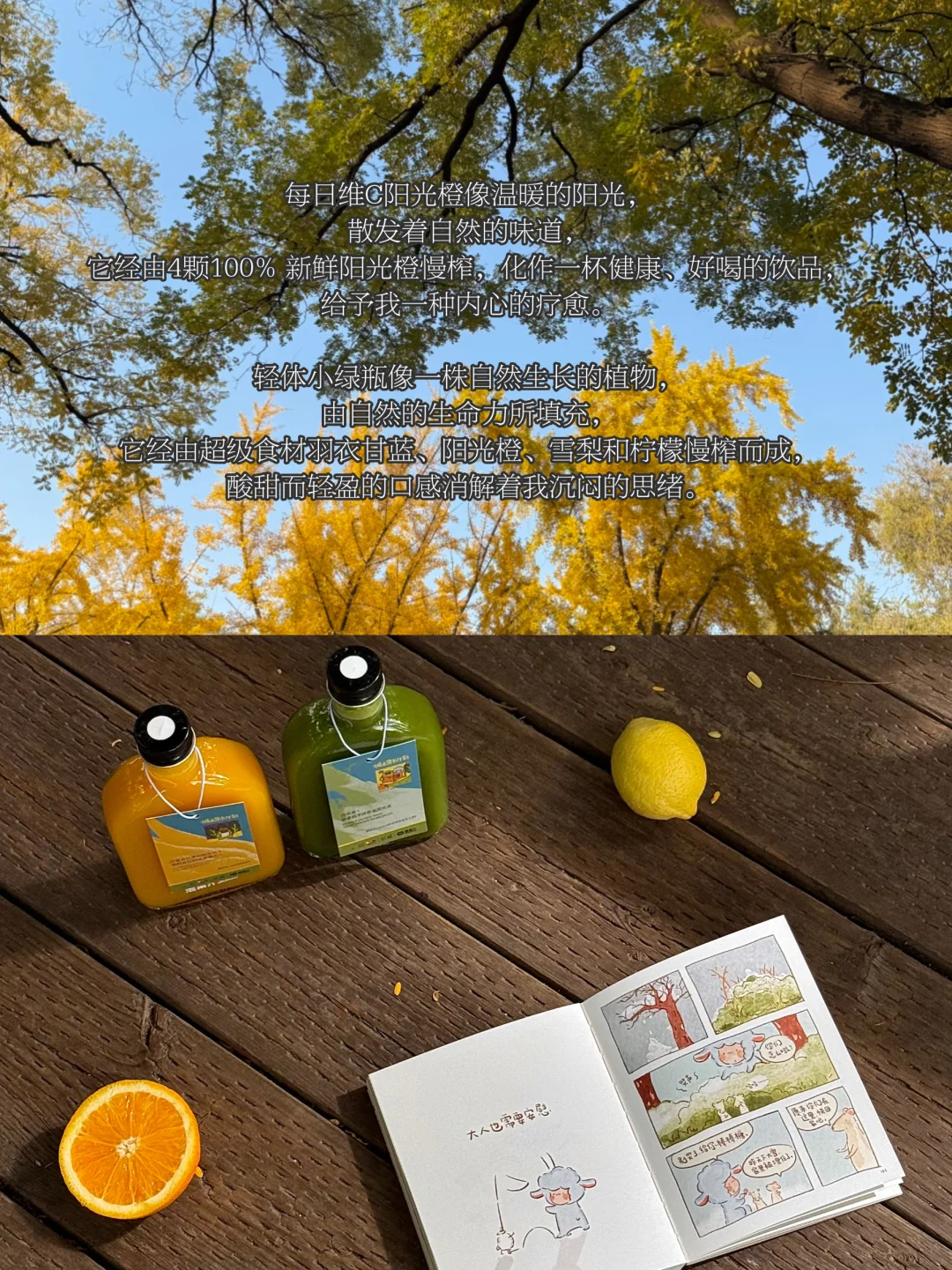 轻体小绿瓶像一株自然生长的植物,由自然的生命力所填充,经由超级食材羽衣甘蓝、阳光橙、雪梨和柠檬慢榨而成,除此之外别无他物,酸甜而轻盈的口感消解着我沉闷的思绪。