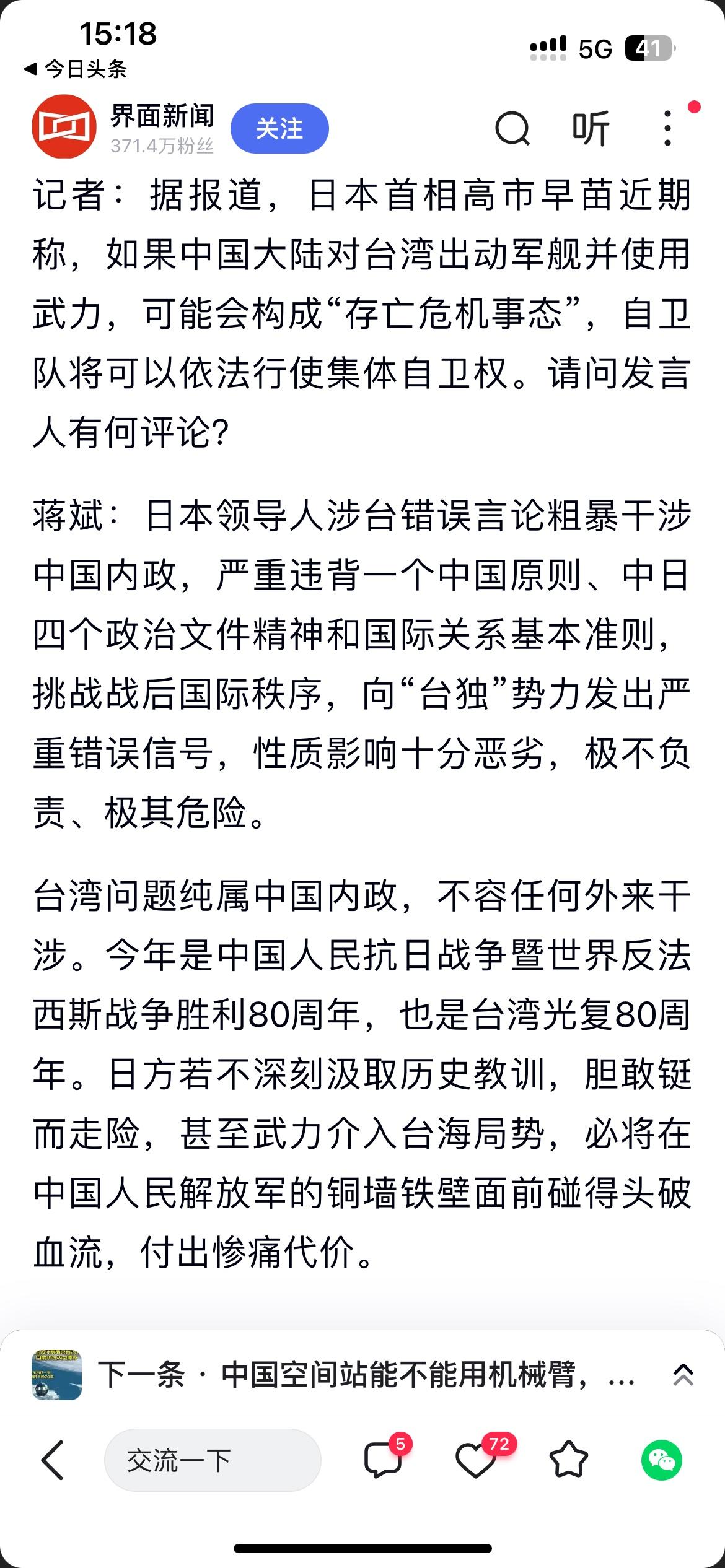 日本首相高市早苗的涉台言论这一次是真的惹起了我们的“冲天怒火”! 从驻大阪总领事的个人言论,再到外交部、国台办、人民日报“钟声”、再到国防部,官方接二连三的发声,对高市早苗言论给予回击和警告。 我们的态度在上强度,从迎头痛击到头破血流,付出惨痛代价,对于日本,必须用它能听的懂,听的透彻的语言。 既然它要伸头,那只有毫不犹豫的咔嚓一下,拿下它的🐶头。