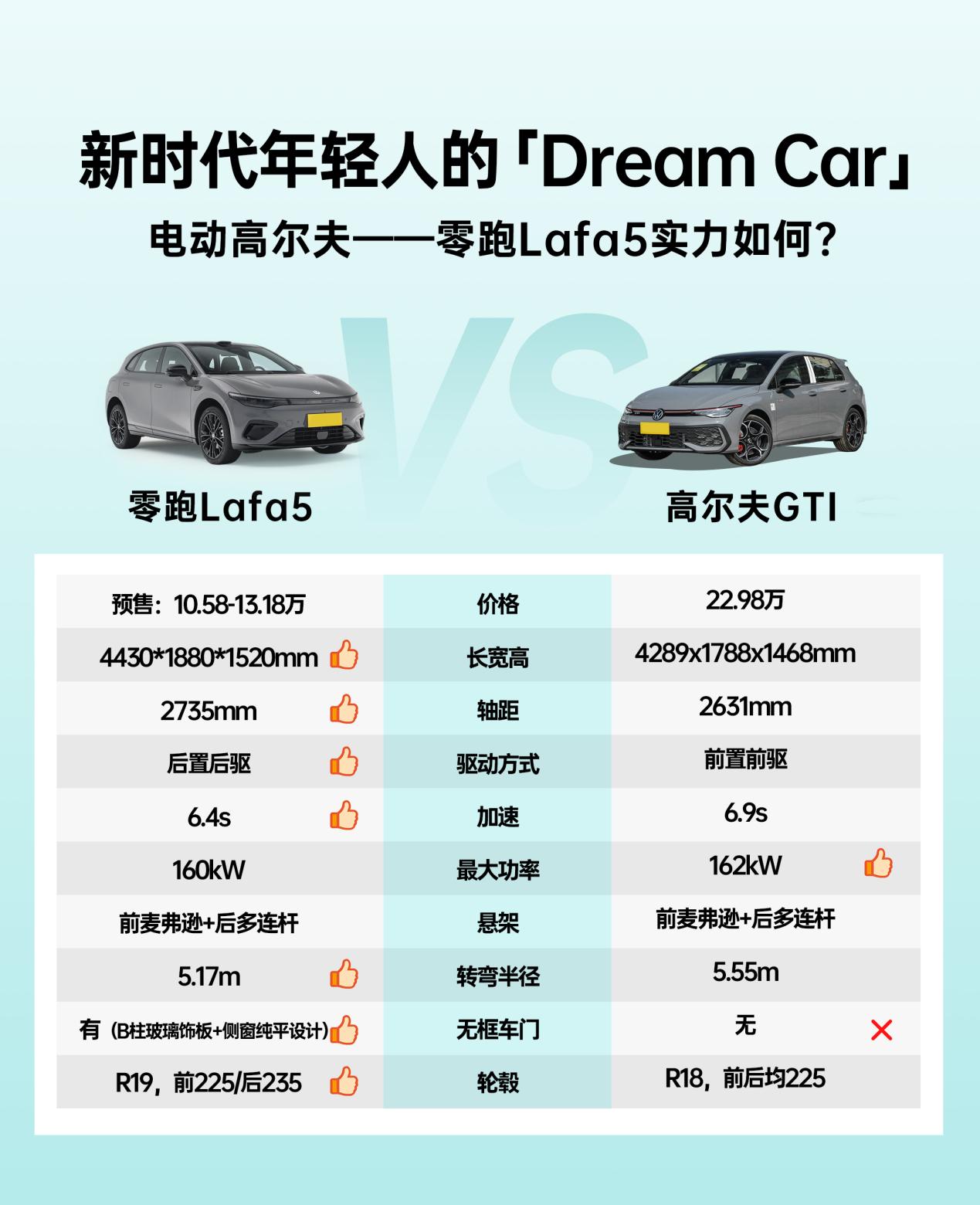 实话讲,年轻人玩车,零跑Lafa5比高尔夫GTI更有情绪价值 造型:都是掀背造型,Lafa5有无框车门、有19英寸“大脚”,还有前窄后宽轮胎,情绪价值更足; 用料:Lafa5用了很多仿麂皮+Nappa全粒面真皮拼接内饰,车内也很有激情; 操控:Lafa5后置后驱,零百加速6.4秒,比GTI快出0.5秒,且是中欧联合调校,操控照样出挑; 配置:Lafa5就是纯纯“欺负人”,座椅通风加热、双AI大模型、激光雷达辅助驾驶…… 敲重点,GTI指导价22.98万,Lafa5预售价10.58万起,上市多半还会降价,相当于10万级就能收获高出20万级的快乐,你说这值不值?要不网上很多网友说零跑是“电动高尔夫”呢,造型、操控都妥妥致敬高尔夫GTI,然后其他配置还更高,预算十来万想买车的年轻人,真的没啥理由拒绝。 零跑汽车 零跑Lαfa5