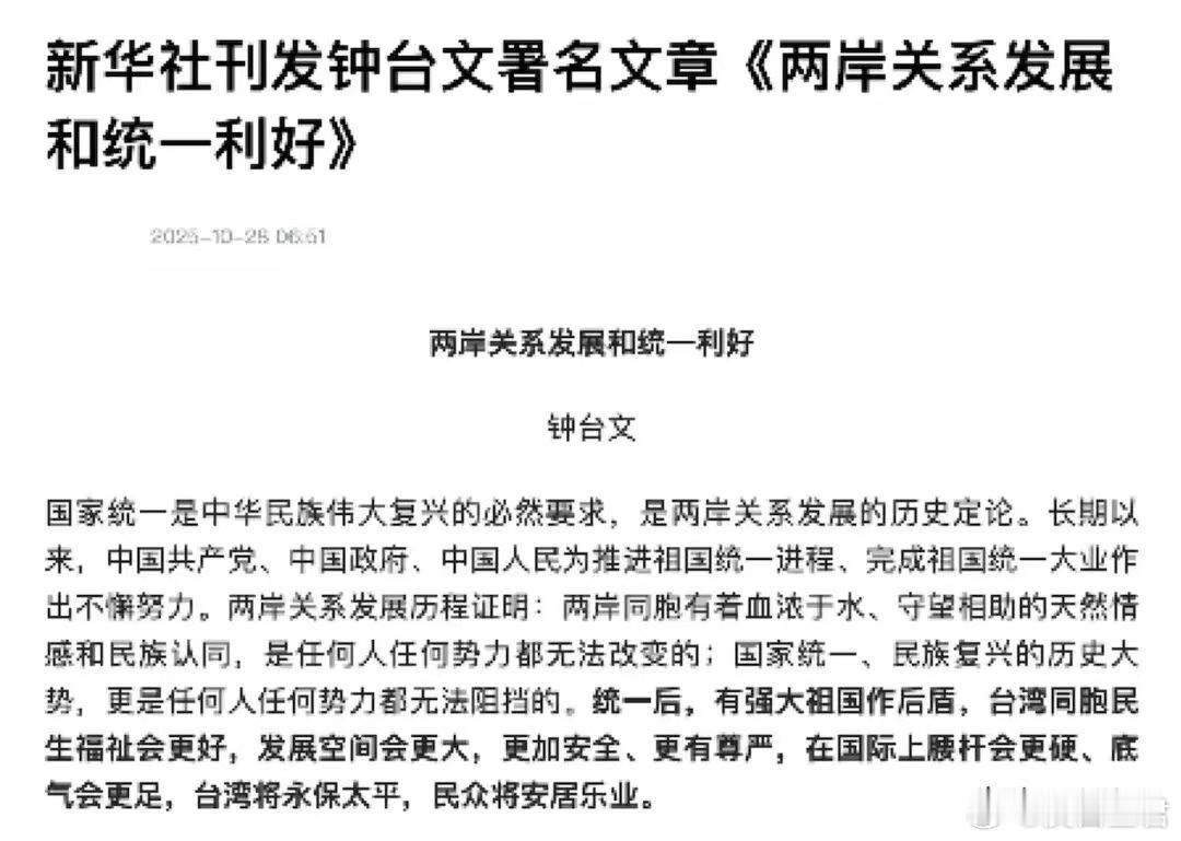 统一信号拉响了?新华社连发三文定调统一,台独势力已无退路摘自:今日头条,这篇文章,我们要聊的是一个正在迅速升温、备受全球关注的议题——台湾统一为何进入了“倒计时”?从法理到军事,从经济到人心,再到国际格局,一系列看似分散的动作,其实背后都有一个共同的核心:祖国完全统一的大势,已经不可逆转。这篇文章会从五个关键方向出发,帮你看清楚背后的深度变化。一、“台湾归来”这步棋,为什么现在落子?很多人都在问,为什么是2025年?为什么是现在突然动起来了?其实,早在几年前,这盘大棋就已经悄悄布局了,只不过,现在终于到了“收官”的阶段。先说一个简单的信号:全国人大一夜之间立法设立“台湾光复纪念日”,这不是一个普通的纪念日,而是一道法理信号。明确告诉全世界——台湾问题不是悬而未决的问题,而是二战后的历史遗留,是属于中国的领土问题。新华社连续三天,三篇署名“中台文”的重磅文章,直接从国际法、历史事实、国家主权三个维度,把台湾问题“坐实”为中国内政,这是最高规格的官方定调。我们过去几十年对台湾问题的说法,其实经历过三次转变:建国初期,我们讲的是“解放台湾”,那时候百废待兴、国力尚弱。改革开放之后,我们开始讲“和平统一”,强调的是民族情感;而现在,直接引用开罗宣言、波茨坦公告,将台湾问题纳入二战战后秩序,以此为逻辑基础,把统一提升到了“国际正义”的高度。这不是简单的“立场重申”,而是为行动提供名正言顺的“出师之名”。从政治学的角度看,这叫做“合法性论证”,从哲学层面来看,这就是黑格尔说的:“凡是合理的都是真实的,凡是真实的也必须是合理的。”二、为什么不“硬打”?“蟒蛇战术”才是当下的最优解很多人可能会疑惑:既然解放军已经有能力在短时间内拿下台湾,为什么还要搞什么“演习”“围岛”“心理战”这些看似“拖延”的动作?答案其实来自一个极其简单又致命的自然现象:蟒蛇捕食。真正的蟒蛇不会一下子咬死猎物,而是缠绕、压迫、收缩——每一次呼吸,都是它勒紧的机会。最后,猎物不是被撕裂,而是被“生理性窒息”。这,就是台海“围而不攻”的战略核心。从2025年4月的“海峡雷霆”演习开始,解放军首次公开“蟒蛇战术”的概念。每一次军机绕台、每一场海上封锁演练、每一次中线突破,都是一次“心理压迫”。不是要打,而是要让对方“习惯被压”,最终陷入心理崩溃。央视甚至公开了登陆演习中,无人机、机器狗、两栖突击车协同作战的画面,这些不仅是军事实战,更是一种“视觉心理战”,让台军逐渐心理麻痹、民众逐渐接受统一的“新常态”。孙子兵法早就说了:“不战而屈人之兵,善之善者也。”今天的台海局势,已经不是“打不打”的问题,而是“怎么让你自己放下抵抗”的问题。三、经济战才是真正的“釜底抽薪”很多人一提统一,就想到军机、航母、导弹,但其实,真正让台独势力坐立难安的,是经济。2025年,中国突然大幅收紧稀土出口。表面上是针对美日芯片产业,但真正命中的是台积电的命门。不要小看稀土,这玩意儿在半导体制造中的地位,就像是血液之于人体。芯片要用17种稀土,中国掌控全球80%的供应和95%的加工能力。一旦稀土断供,台积电再牛也只能“巧妇难为无米之炊”。更关键的是,台湾经济高度依赖大陆——42%的出口是卖给大陆的!一旦大陆政策性转向,台湾的GDP可能半年内腰斩。你还记得2021年的凤梨事件吗?大陆只是暂停进口了一种水果,台湾社会就已经哀鸿遍野。如果是全面封锁,那后果可想而知。但我们不是要饿死谁,而是要让台湾同胞在现实中“醒”过来。当电价涨了三倍、工厂停工、超市货架空空如也,人们自然会问:这是谁造成的?答案只有一个——“台独”把路堵死了。并且,台独至今都没明白。统一不是靠打出来的,而是靠民心赢下来的。就像前段时间,有消息传出,说是20万台湾民众主动下载“归家APP”,填写回归意愿。这个数字虽然不大,但意义非凡。心理学上有个理论叫“沉默螺旋”——当一种观点被认为是“政治不正确”时,人们会选择沉默。但一旦有人站出来,就会引发“破圈效应”。这20万人,其实就像是“破裂的第一道口子”,说明支持统一已经不再是“禁忌话题”。哪怕在高雄、台南这样的绿营大本营,也有超过3万人主动登记。更值得关注的是,台湾的政治精英也开始转向。国民党新主席郑丽文公开喊出:“我是中国人!”并坚持九二共识,最终得票率碾压对手。这说明一个问题:统一,不再只是民间呼声,更是政治层面的觉醒。历史上有过很多类似的时刻。比如1948年,北平守将傅作义,手握25万大军,却选择起义投诚,不是因为打不过,而是因为人心已变,大势已去。四、美国的“护台神话”,已经不攻自破很多人总觉得“美国不会允许台湾被统一”,但现实是——美国已经开始“弃台”了。从特朗普亚洲行不提台湾,到兰德公司明确建议“回避台海冲突”,再到拜登政府陷入债务危机、政府关门、军费紧张,以及特朗普在第二期任期内的种种吃瘪......一切都在说明:美国已经力不从心。中美脱钩会导致全球GDP下滑7%,美国自己也受不了。军事上,面对解放军在家门口的部署,美国航母根本不敢轻易靠近。政治上,美国国内问题一大堆,根本顾不上“保台”。别忘了,美国抛弃盟友的“历史战绩”