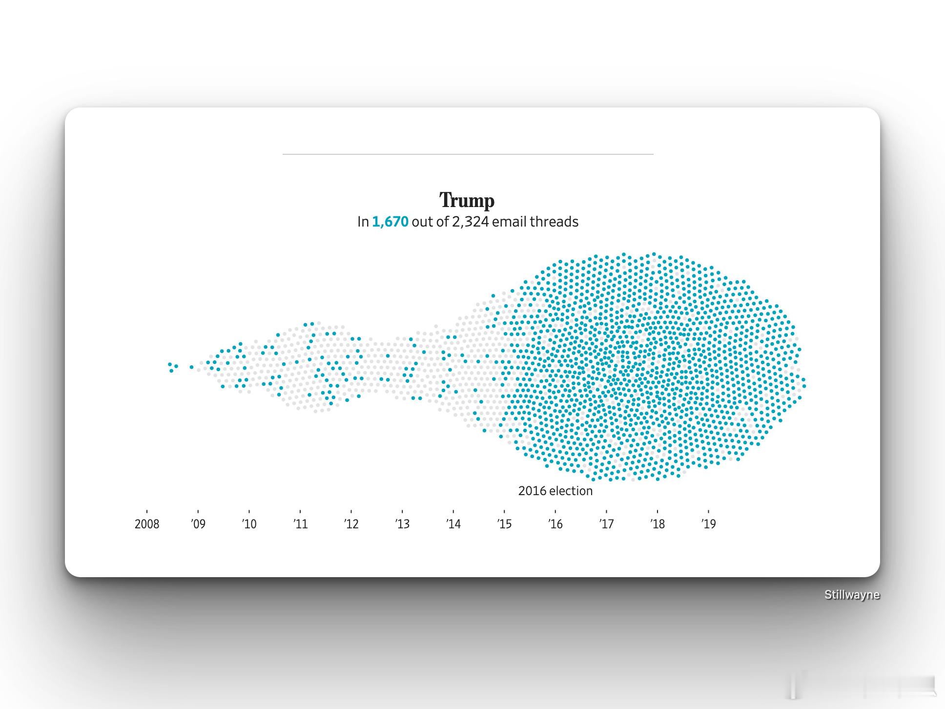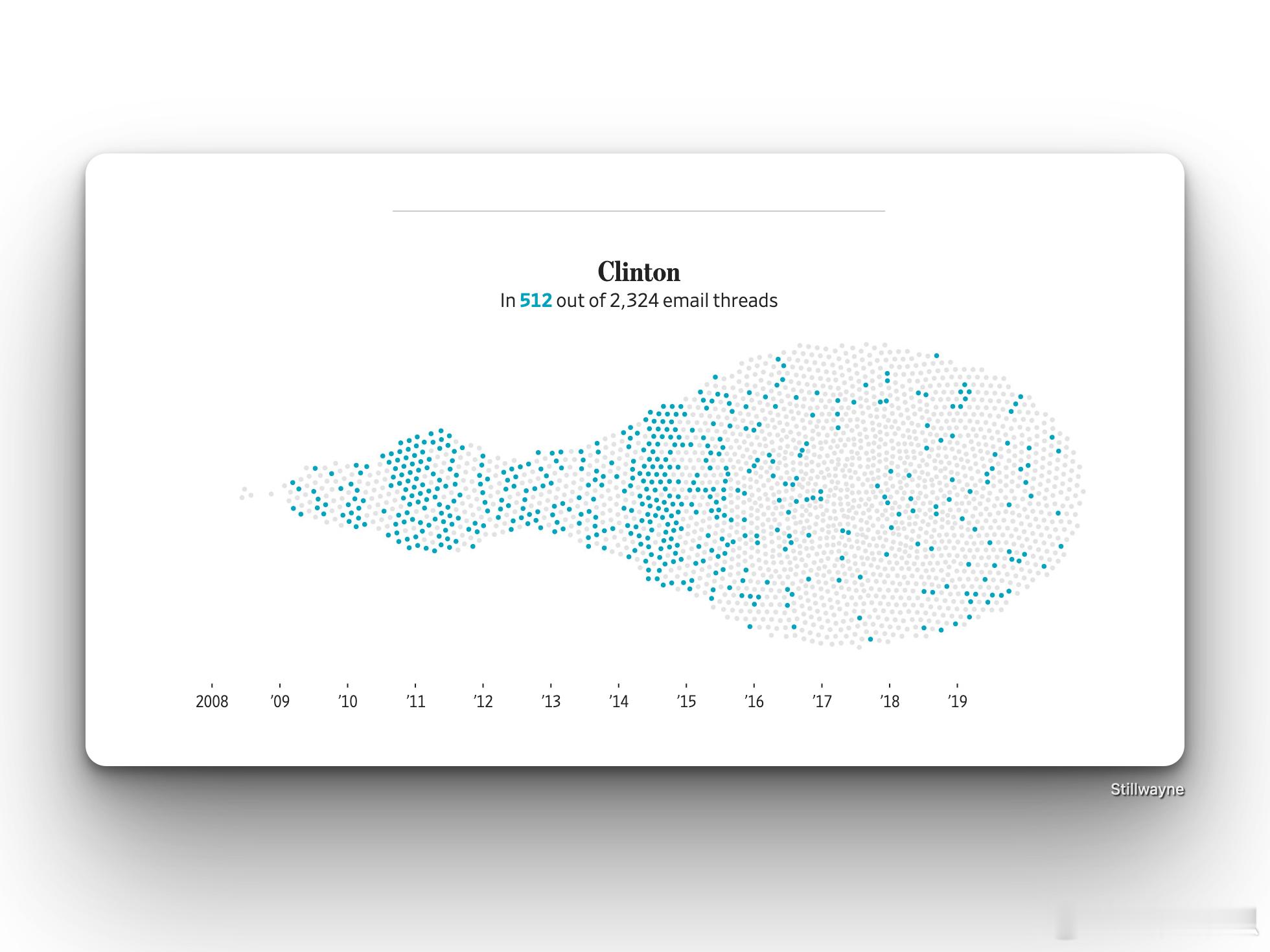 本周美国国会公布的2300多封爱泼斯坦邮件中,有1670封提到了特朗普。讨论密度和发送时间如图1所示,横轴为时间,每一个点都代表一封邮件,蓝点是涉及或提及特朗普的。图2是提及或涉及克林顿的,有512封。
