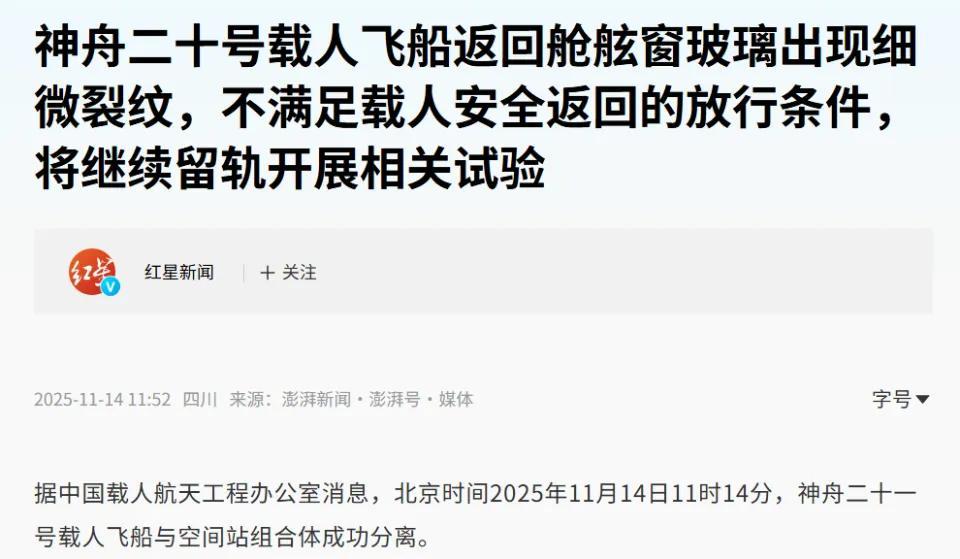 11月15日,据央视新闻直播间报道,昨天,中国🇨🇳载人航天办公室公布,神舟20号载人飞船在前期拍照判断、设计复核、仿真分析和风洞试验基础上,经综合评估,神舟20号载人飞船返回舱舷窗玻璃出现细微列纹,最大可能受空中碎片撞击所致,不能满足载人安全返回放行条件! 神舟20号载人飞船将继续留轨开展相关试验。 另外,神舟22号载人飞船将择机无人发射,正在进行多项测试,虽然没有航天员进入到空间站,但是将搭载许多物资、设备及生活用品。[赞][赞][赞][赞][赞]