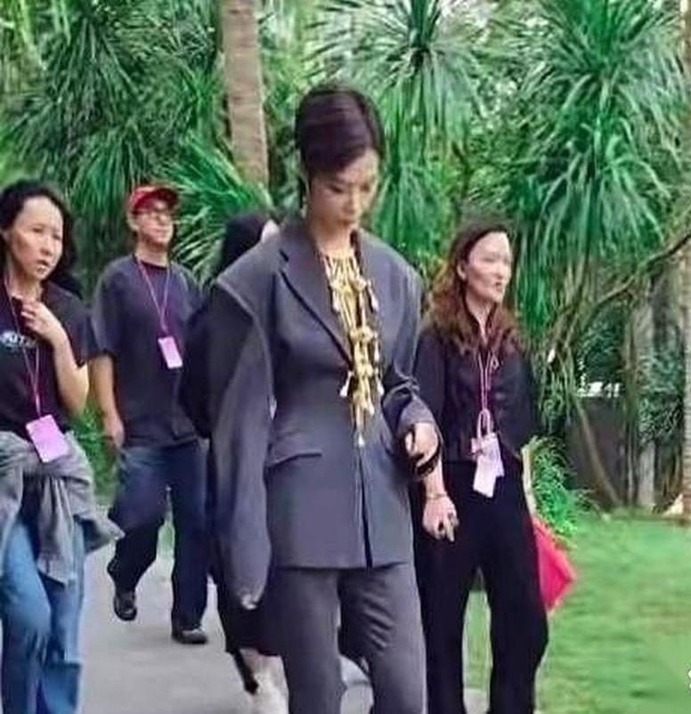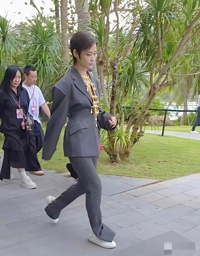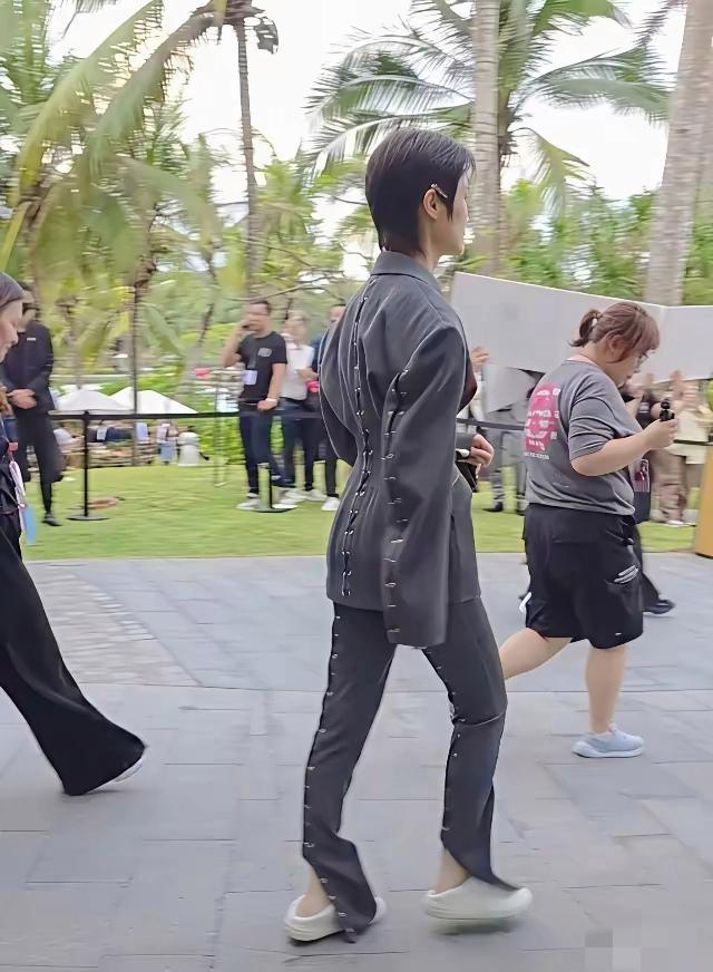 哇哦,镜头中身着一身深灰色工装的李宇春也瘦成了纸片人!真是名副其实的楚腰卫鬓,肩若削成,平板身材哈,颈间佩戴的粗款天价金链太抢镜,总感觉耳际的小夹子纯属多余,你觉得呢?