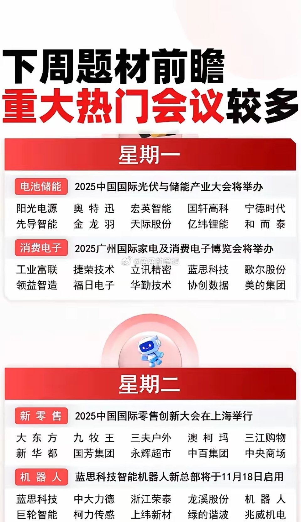 题材前瞻!下周二财经信息梳理分别覆盖新零售与机器人赛道:2025中国国际零售创新大会聚焦零售行业的数字化转型、全渠道融合等创新方向,将提升线下零售、商超类企业的关注度;蓝思科技智能机器人新总部启用,是企业在智能机器人领域的布局落地,会带动机器人产业链(核心部件、本体制造等)相关企业的热度,两个会议分别关联消费零售与高端制造细分赛道。个股梳理新零售板块1. 大东方:属新零售赛道,主营百货零售、汽车销售等,布局线下实体网络。此次零售创新大会聚焦的零售数字化、业态升级,或推动其优化线下场景、拓展线上渠道,助力零售业务的创新转型,契合行业融合升级方向。2. 九牧王:以男装零售为核心,覆盖线下门店与线上电商。零售创新大会关注的全渠道布局,契合其“线下体验+线上销售”的发展逻辑,利于强化男装零售的数字化运营,提升消费触达与转化效率。3. 三夫户外:聚焦户外用品零售,涵盖装备、服饰,布局线下门店与线上平台。大会推动的零售场景融合,可助力其打通线上线下户外消费场景,增强用户体验与品牌粘性,适配户外零售的创新需求。4. 澳柯玛:业务覆盖家电零售、冷链装备,布局线下渠道与电商。大会聚焦的渠道创新,或推动其优化家电零售的线上线下联动,同时拓展冷链相关零售配套服务,契合零售业态的多元化升级。5. 三江购物:浙江区域商超龙头,布局社区零售与新零售业态。大会助力其深化“商超+数字化”模式,优化社区零售的供应链与配送体系,提升区域零售的服务效率与用户覆盖。6. 新华都:以福建区域零售为核心,涵盖商超、百货。大会关注的零售数字化改造,契合其提升线下门店数字化运营的需求,利于优化区域零售的商品管理与用户触达能力。7. 国芳集团:主营百货零售,布局线下实体门店。大会推动的零售业态创新,或助力其升级百货门店的消费场景,融入体验式零售元素,提升线下门店对消费者的吸引力。8. 永辉超市:全国连锁商超龙头,深度布局社区团购、线上配送等新零售模式。大会将强化其“商超+数字化”的模式优势,助力进一步优化供应链、拓展全渠道零售的覆盖范围。9. 中百集团:湖北区域商超企业,覆盖超市、百货。大会聚焦的全渠道布局,利于其深化社区零售与线上配送的融合,提升区域市场的零售服务能力与用户粘性。10. 中央商场:以百货零售为核心,布局线下实体网络。大会推动的零售转型,或助力其升级百货业态,融入数字化运营与体验式消费,增强线下零售的市场竞争力。机器人板块1. 蓝思科技:除消费电子业务外,布局智能机器人领域,其智能机器人新总部将于11月18日启用。此次总部启用是其机器人业务的重要落地动作,将推动研发、生产端的布局,强化在机器人赛道的参与度。2. 中大力德:聚焦机器人核心部件,主营减速器、电机,是工业机器人产业链的配套企业。蓝思科技机器人总部启用带动的赛道热度,将提升其核心部件的市场需求,契合机器人制造的配套方向。3. 浙江荣泰:主营散热部件,产品适配机器人热管理需求,是机器人产业链配套商。赛道热度提升将推动其散热部件在机器人领域的应用,助力拓展高端制造配套市场。4. 龙溪股份:生产关节轴承,是机器人关节结构的核心配套供应商。蓝思科技机器人业务落地带动的产业需求,将提升其关节轴承的关注度,契合机器人本体制造的部件采购需求。5. 机器人:工业机器人本体制造龙头,覆盖研发、生产与应用。赛道热度提升将强化其在本体领域的核心地位,利于拓展下游工业、服务等应用场景。6. 巨轮智能:布局工业机器人,同时涵盖轮胎装备,是装备与机器人融合的企业。赛道热度提升将助力其拓展工业机器人应用市场,强化“装备+机器人”的业务布局。7. 柯力传感:主营传感器,适配机器人感知系统需求,是核心部件供应商。蓝思科技机器人业务带动的需求,将提升其传感器在机器人领域的应用规模,契合赛道配套方向。8. 上纬新材:生产复合材料,用于机器人结构部件制造,是产业链材料供应商。赛道热度提升将推动其复合材料在机器人领域的采购需求,拓展高端制造材料市场。9. 绿的谐波:谐波减速器龙头,是全球重要供应商。赛道景气度提升将增加其减速器需求,强化在核心部件领域的行业地位。10. 兆威机电:主营微型传动系统,适配小型智能机器人精密传动需求。赛道热度提升将助力其拓展小型机器人传动部件市场,契合赛道细分场景需求。总结下周二的两场会议分别撬动新零售与机器人赛道,20只个股覆盖了零售行业的实体业态、全渠道布局,以及机器人产业链的核心部件、本体制造、材料配套等环节。新零售个股聚焦零售数字化与业态升级,机器人个股围绕产业链配套与业务落地,两场会议将提升对应赛道的关注度,个股可依托自身业务契合度承接赛道红利。本文涉及资讯、数据等内容来自网络公共信息,仅供参考,不构成投资建议!