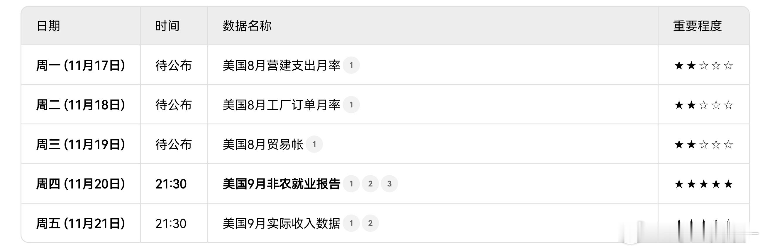 下周美国重要经济数据发布日程,重点关注下周四公布的非农就业报告(9 月)。该报告原定于10月3日发布,但由于43天的政府停摆而被推迟。