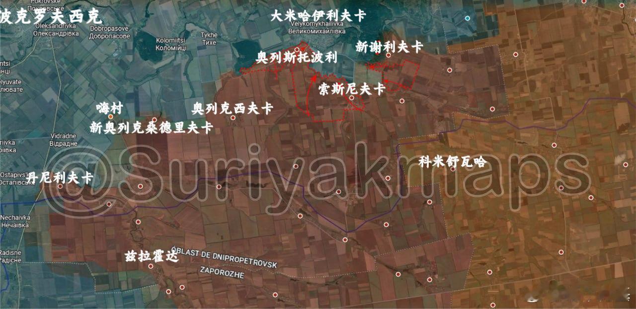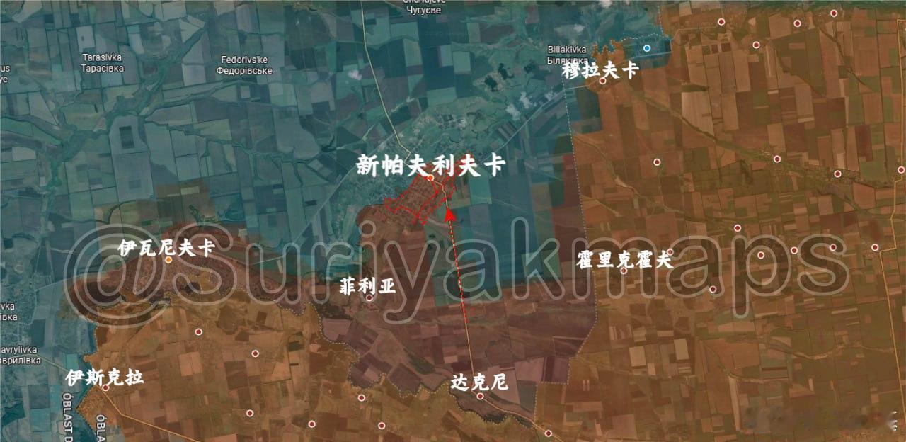 俄军在新帕夫利夫卡地区取得了重大进展,并占领了索洛纳河东岸的大部分居民区。此外,俄军完全控制了奥列斯托波利以及沃夫恰河南岸与大米哈伊利夫卡隔河相望的整个区域。凭借此次推进,俄军重新夺回了索斯尼夫卡,并从南部完全控制了新谢利夫卡。此外,俄军还从新谢利夫卡以西渡过沃夫恰河,进入了林区。来源:Suriyakmaps