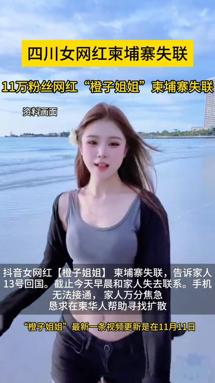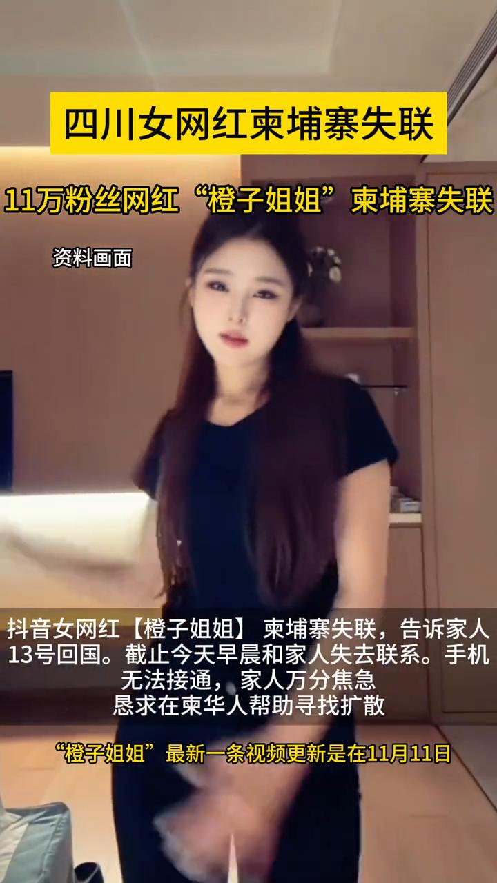 四川女网红柬埔寨失联。 11万粉丝网红"橙子姐姐"柬埔寨失联。抖音女网红【橙子姐姐】柬埔寨失联,告诉家人13号回国。截止今天早晨和家人失去联系。手机无法接通,家人万分焦急,恳求在柬华人帮助寻找扩散。"橙子姐姐"最新一条视频更新是在11月11日。