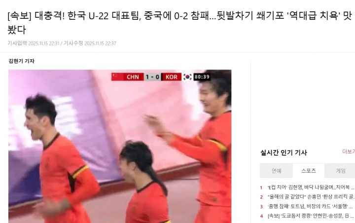 韩媒标题:[突发新闻]震惊!韩国U22队0-2惨败中国......一记脚后跟破门锁定胜局,这是一场前所未有的耻辱。