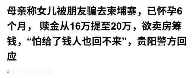 贵阳女田女士儿被朋友骗到柬埔寨,怀孕6月求救“撑不住了”,母亲欲卖房赎人:怕给了钱人也回不来 据大河报报道,今年三四月份,田女士的女儿在朋友介绍下,从广州飞往柬埔寨金边。 今年三四月份,田女士的女儿在朋友介绍下,从广州飞往柬埔寨金边。 说是有一份薪资不错的工作,手续简单,不懂外语也能做。护照办得很快,机票也有人帮忙订。 说是有一份薪资不错的工作,手续简单,不懂外语也能做。护照办得很快,机票也有人帮忙订。 田女士没多问,只觉得女儿年纪不小了,想出去闯一闯也正常。 田女士没多问,只觉得女儿年纪不小了,想出去闯一闯也正常。 但她没想到,这一去,就是半年无音讯。 不要想着高新薪,个人觉得没有100%把握不要随便到国外,特别缅甸、柬埔寨、老挝等等。这些大家都知道听到他们的恐怖之处了吧,都是电诈团伙豪无人性。 这些骗人都是有话术的,工资高,轻松,都说深圳有家公司招人,薪资待遇8-10000,然后到深圳面试,去云南培训,到了云南先玩一天,晚上坐大巴就到缅甸了。 只能说骗子是团体作案,单个人再聪明也没有用,骗子天天就是想方设法骗人,无孔不入,派出所报案被骗的层出不穷。我被骗了几十个,报案两个多月了,警察说钱是回不来了,早转移到国外了,如今度日如年。没有被骗的时候都是大智大慧的,骗了才知道其实骗子无处不在!不是你不聪明,是骗子到处挖坑,等着你的。