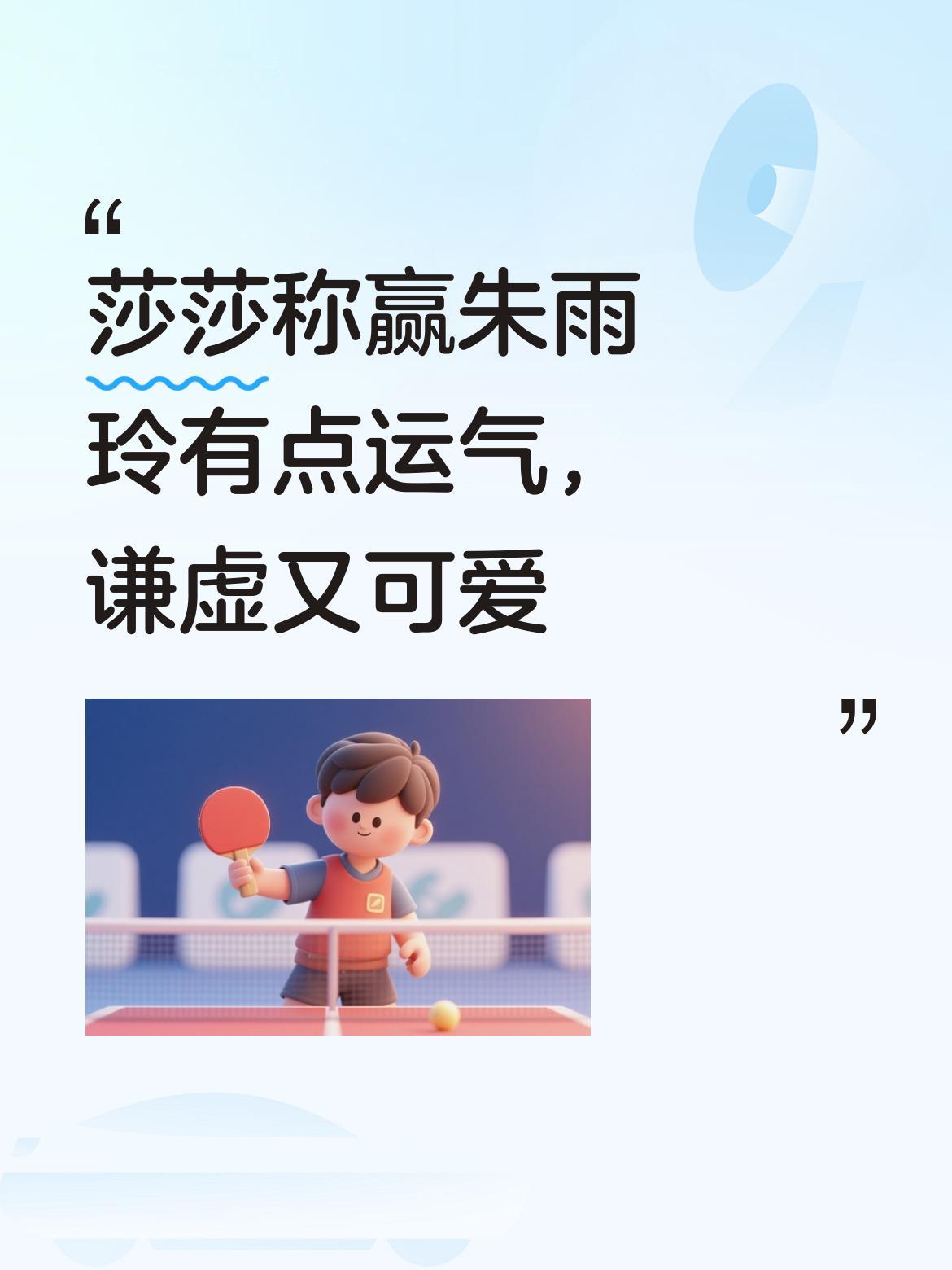 莎莎实在是好谦虚、好可爱呀!在赛后采访中,她表示能赢朱雨玲觉得自己多少是有点运气在的 。 第一局9:11输掉后,第二局马上调整过来,以11:4迅速拿下, 第三局打得十分纠结,朱雨玲拿到局点,莎莎逆转12:10取胜,第四局一直打到11平,莎莎13:11拿下。这不能算是运气,说明关键时候孙颖莎更坚定更大胆。 第五局孙颖莎完全进去状态,以11:6拿下进入决赛,会师王曼昱。