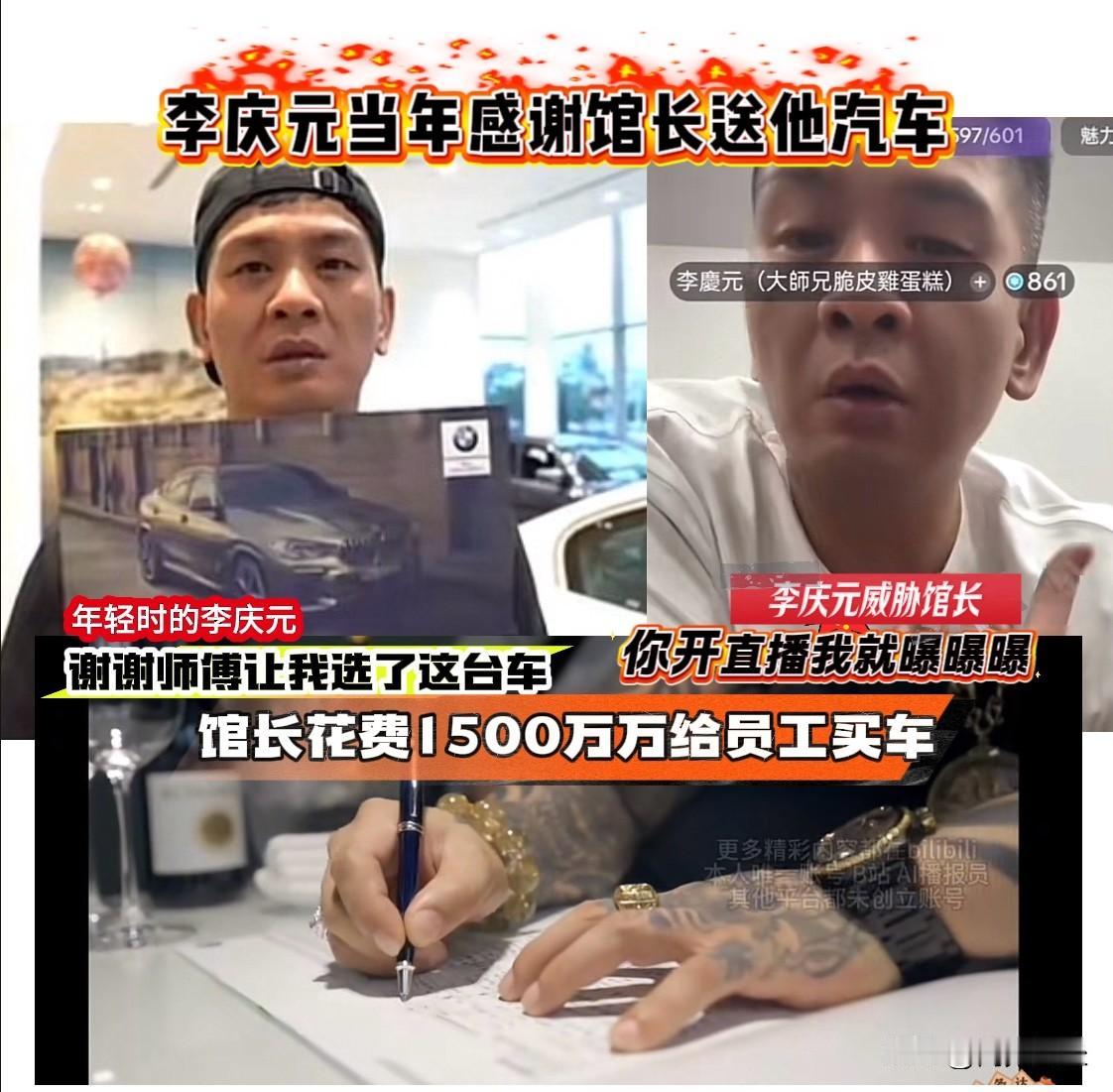 馆长为李庆元买车,现场画面曝光 一段旧视频流传在网络上,馆长与大师兄李庆元师徒两人的一段往事被还原在观众面前。 视频记录下馆长花1500万为员工买车的场景,李庆元是其中的一名。 彼时的李庆元看起来很年轻,他在镜头前手握汽车的海报,略带羞涩的发声感谢馆长。称“谢谢师傅让我选了这台车” 世上的人和事,真的是此一时彼一时。时光如白驹过隙,转眼物是人非。 2025年11月,李庆元开直播举手发誓:我说的都是真话。 接着他在直播间用一个多小时,说了很多对馆长的不满。 李庆元在直播时威胁馆长,不让其开直播。称“你要开直播,我就曝曝曝”。 李庆元从一名普通员工做到公司副总,成为馆长事业上的伙伴,说明馆长对他是非常信任的。馆长给他买车,他后来坐到了副总的位置,这就是最好的证明。 李庆元为何突然背刺馆长,事情来的太突然,观众们一时不明真相,网络上充斥着的是大量的猜测。