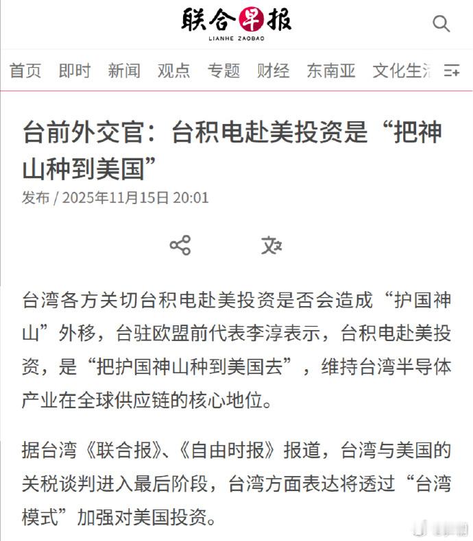 囼湾前驻欧盟外交官:台积电赴美投资是“把神山种到美国”。“护国神山,说搬就搬”!在统一之前掏空囼湾,是美国乃至西方以及岛内囼毒势力的最大共识。