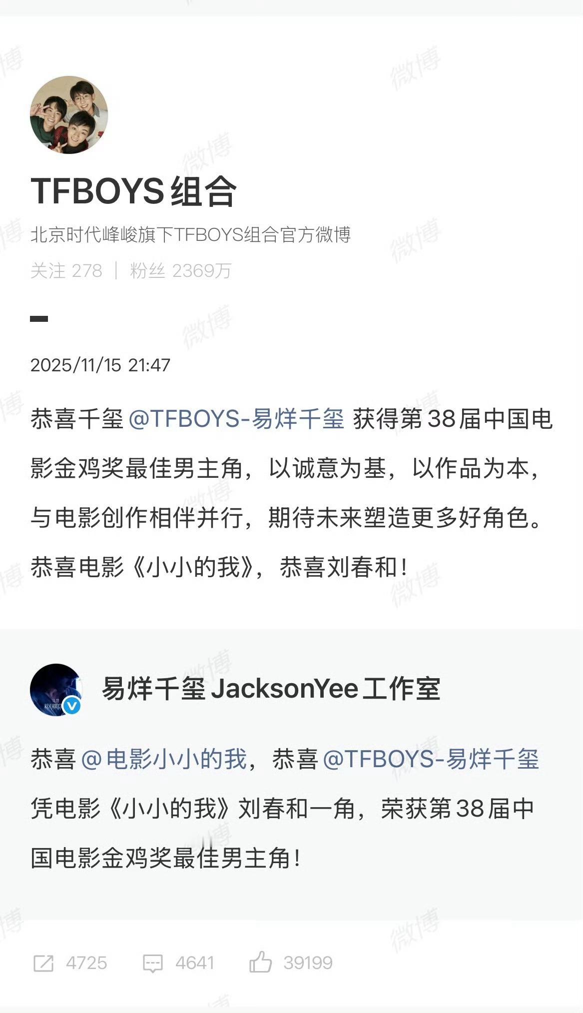 TFBOYS恭喜刘春和!易烊千玺24岁金鸡封帝实至名归TFBOYS官博发文恭喜刘春和,正是为拿下金鸡奖最佳男主的易烊千玺喝彩!四次提名终圆梦,24岁的他成为影史最年轻金鸡影帝之一,这份荣耀全靠演技说话。为诠释《小小的我》中脑瘫少年刘春和,易烊千玺减重20斤、沉浸式体验生活,从蹒跚步态到含泪眼神,细节拉满还原角色质感。无台词名场面凭微表情直击人心,让观众彻底共情刘春和的倔强与渴望。从《少年的你》到《小小的我》,易烊千玺用实力撕掉流量标签,以敬畏之心打磨演技。恭喜演员易烊千玺,年轻有为,未来可期!