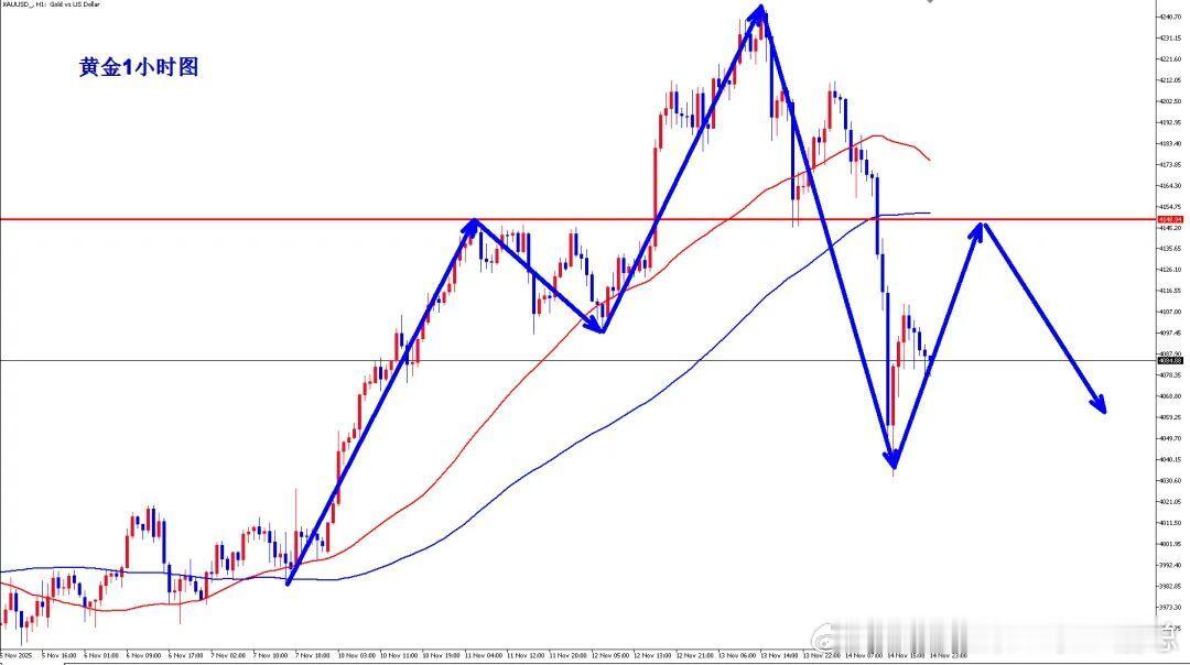 【市场消息】本周金融市场关注焦点在美国政府结束停摆以及美联储降息前景上面,主要资产方面,现货黄金走势格外引发关注。近期官员谈话偏向鹰派,使交易员对12月降息25个基点的预期从1个月前的约95%,大幅降至不足五成,这令伦敦金价涨势突然发生反转。尽管本周末前市场出现明显的获利了结,但黄金仍有望录得周线涨幅,并在 4000 美元/盎司上方构筑新的支撑。 黄金未来15天中长期趋势依然完好,但短期受到美联储降息前景不明的影响,被迫进入 “区间震荡”模式。受更广泛市场抛售拖累,古市同步大幅下跌,因全球市场对美联储更趋鹰派的表态作出反应。国际黄金通常在经济不确定性上升或低利率环境中表现强劲;但若市场剧烈波动、资金全面撤离,短线避险买盘也会被削弱。 与此同时,本周亚洲主要市场的实物黄金需求整体偏弱,表明即便金价年内大涨、市场波动加剧,短期内买盘情绪仍显谨慎。从宏观周期而言,即便金价确实出现双向波动,或在未来数月跌至4000美元下方,这都将可以被视为长期趋势中的技术性回调。【技术分析】黄金本周大起大落,前半周大涨,后两天受消息面影响几乎跌回原点,受停摆结束影响,以及美联储相关人员再放鹰派言论,导致黄金出现大幅回落调整跌最低至4032一线附近,将近180跌幅,周线收官日线最终收阴。下跌幅度不算小,足以说明金价未来15天上涨还需面临更大的压力,市场看涨情绪得到缓和!下方4000整数关口是关键,如果守得住,可能还能震荡一阵子;要是破了,估计得往3930甚至更低的3886附近去找支撑。4小时级别处于调整阶段,要是能收复失地,重新站上关键均线,多头还有点盼头;不然空头可就要继续撒欢了。黄金1小时短线也已经形成头肩顶结构,黄金下周不能重新站稳4150上方,那么黄金1小时的反弹就是构筑头肩顶结构的右肩,那么黄金下周反弹承压4150下继续逢高空,黄金周五大跌之后,那么周初可能先反弹修正,然后看反弹力度的强弱,如不继续承压4150,那么就是继续顺势空。后续金价走势,终究要回归风险、政策与数据的博弈。无论是未散的停摆风险、美联储的政策表态,还是陆续补发的经济数据,都可能成为行情的“催化剂”。唯有紧盯关键信号、顺势而为,才能在跌宕起伏的黄金市场中把握机会。