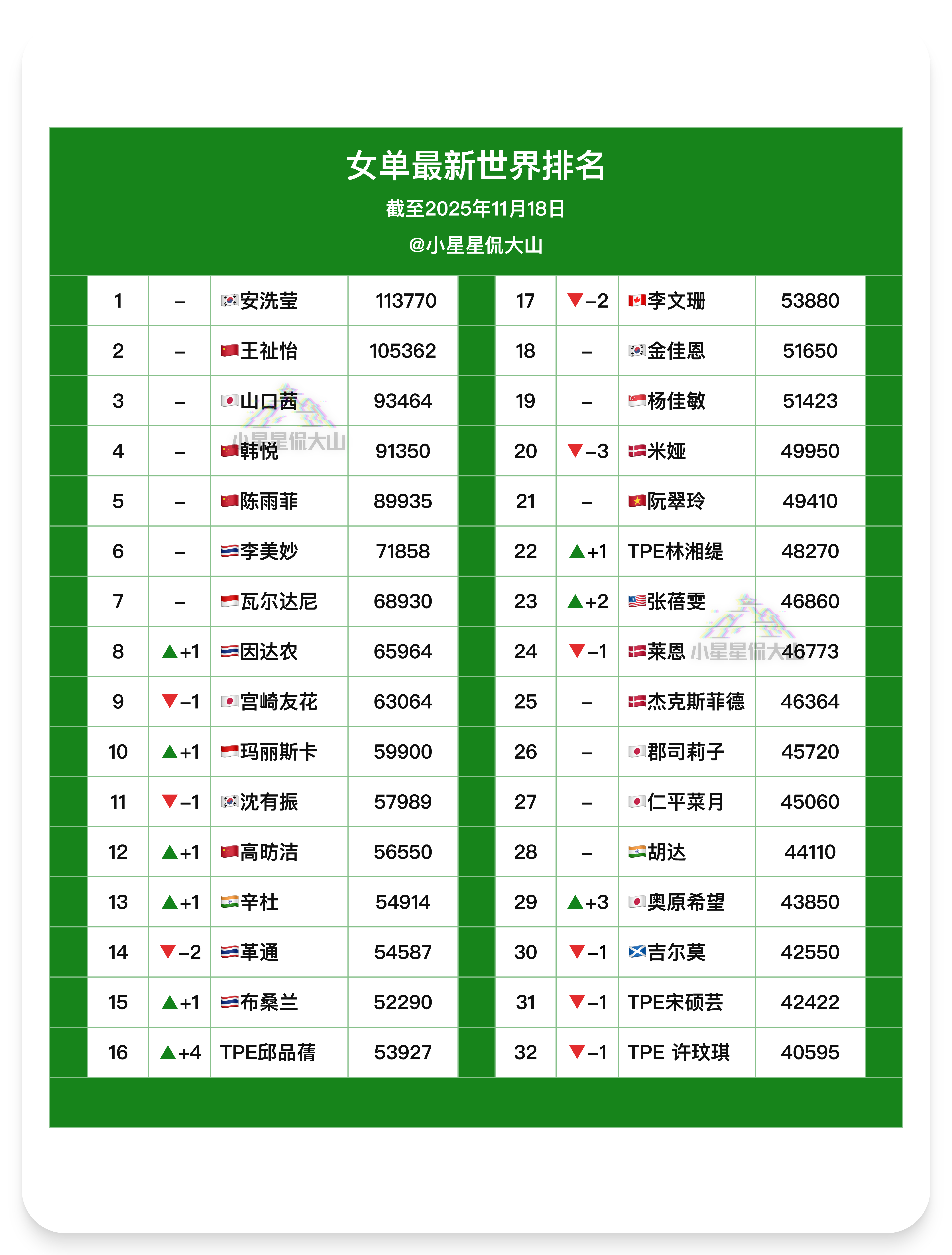 【最新女单世界排名】🇨🇳王祉怡 2🇨🇳韩悦 4🇨🇳陈雨菲 5🇨🇳高昉洁 14🏆因达农 9➡️8🥈玛丽斯卡 11➡️10🇨🇳韩千禧 35