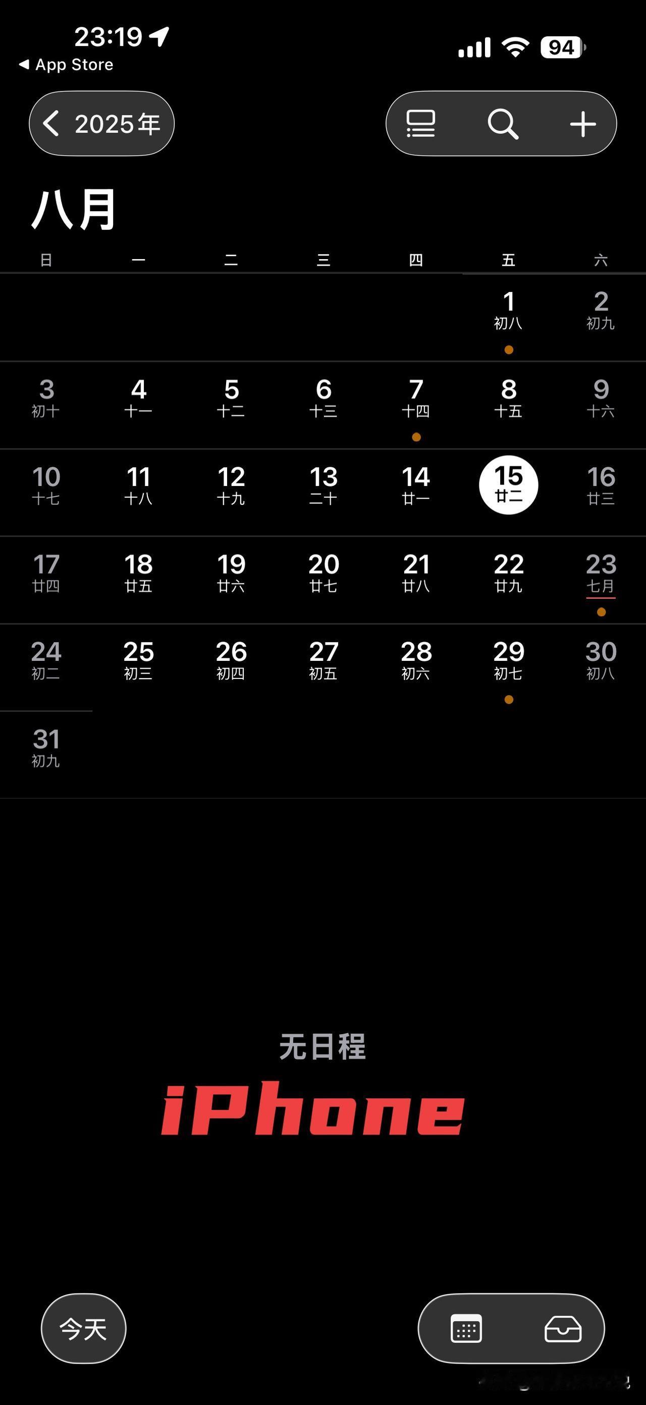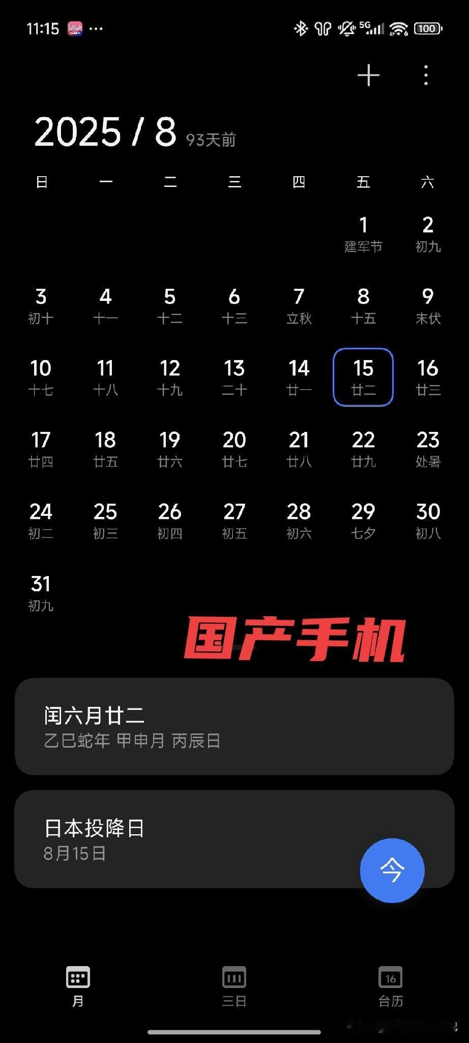 这就是苹果手机和国产手机的最大区别,你发现了吗?都说苹果手机和国产手机差异最大的是操作系统和外观设计,其实要我说最大的区别就藏在日历里面。不信你去找一部国产手机点开日历,然后找到每年的8月15日,你就会发现有的品牌直接在日期下面写着“日本投降日”,有的干脆单独在日历下方分出一栏标注为“日本投降日”。但如果你去找苹果手机的日历,翻到同一天你永远找不到这几个字:所以,我说日历才是两种手机的最大区别,老铁们同意不?