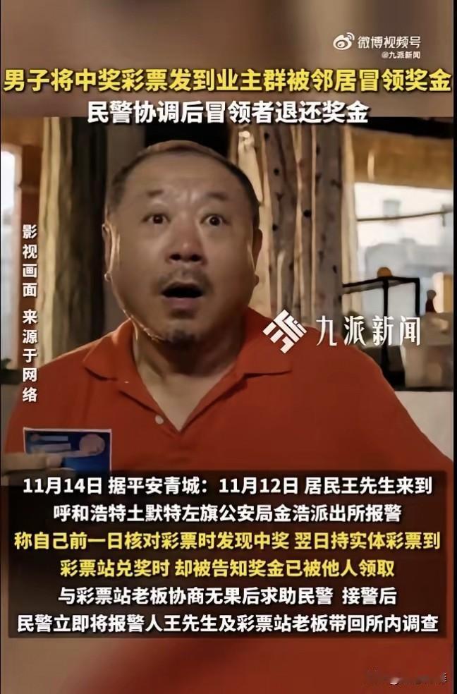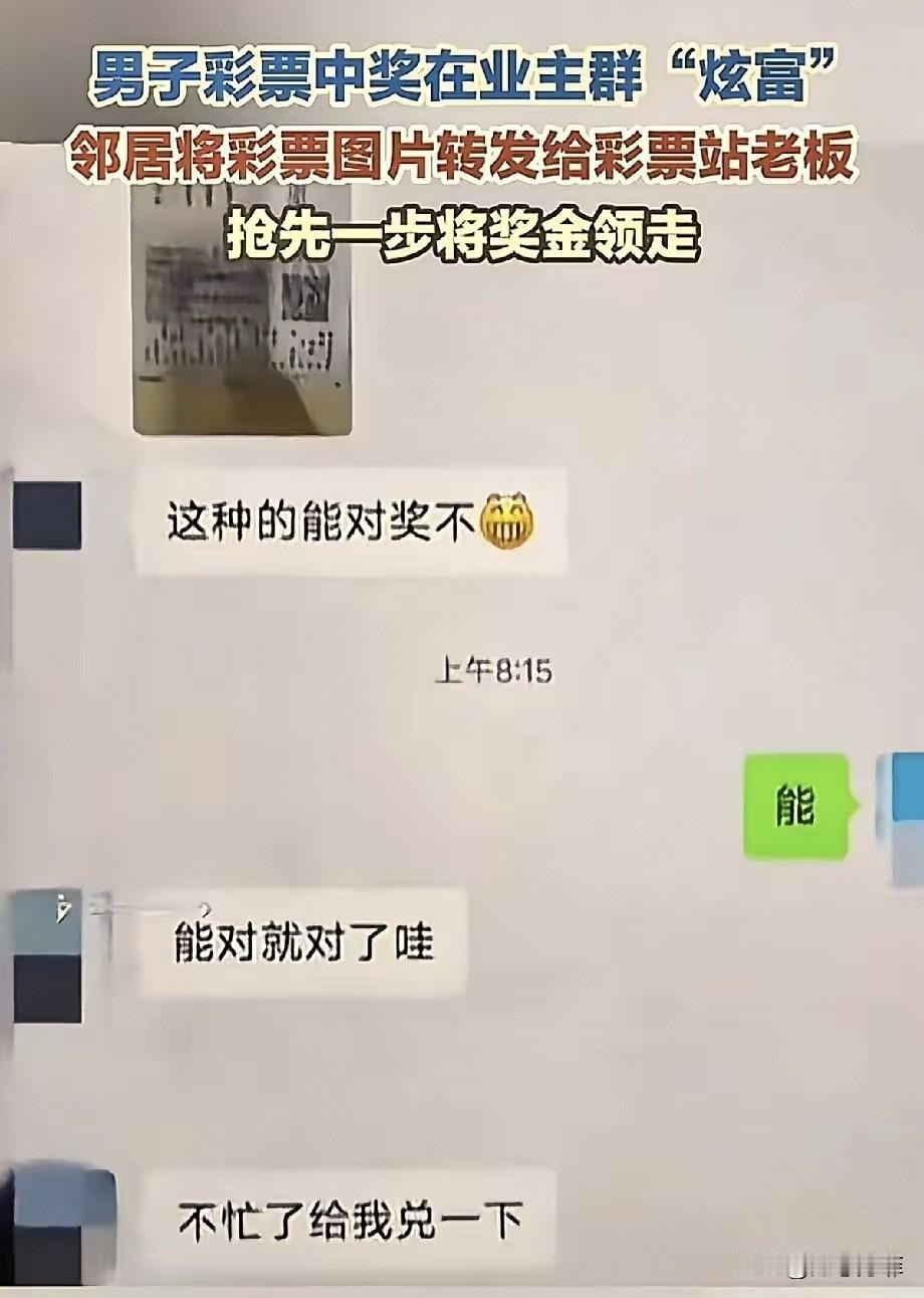 内蒙古,一男子彩票中奖,因为太过兴奋,就拍了照片发在小区业主群,想狠狠炫耀一番,没想到,第二天他去兑奖时被告知彩票已经兑换过了。 男子发现自己彩票中奖了,高兴得不行,也没多想,就把彩票的照片发到了小区业主群,想和大家分享好运。 ​ 结果一位邻居看到照片后,起了贪念,他保存了照片,直接发给了彩票站的老板,还说自己在外地,没法亲自去兑奖,让老板把奖金用微信转过来。 刚好这位邻居又是这家彩票站的老顾客,老板平时跟他挺熟,而且这次中奖金额不算高,老板简单问了两句就把奖金转给他了。 ​ 第二天男子拿着彩票去兑奖,结果老板说奖金已经转出去了,被人领走了。 男子当场就懵了,彩票明明还在自己手里,怎么会被兑走,跟老板吵了半天,之后才反应过来是自己发群里的照片惹的祸,赶紧报了警。 ​ 民警一调查,很快就查到了冒领的邻居,最后在民警的劝说下,邻居把奖金退给了彩票站。 男子觉得邻居是一时糊涂,就原谅了他,也拿回了自己的奖金。 邻里之间本来应该互相照应,但这个邻居却见利忘义,冒领奖金,既丢了人品,还差点触犯法律。 男子虽然是受害者,但自身也有疏忽,中奖彩票是重要凭证,不能随便拍照发群里,就算再高兴,也要守住隐私底线。