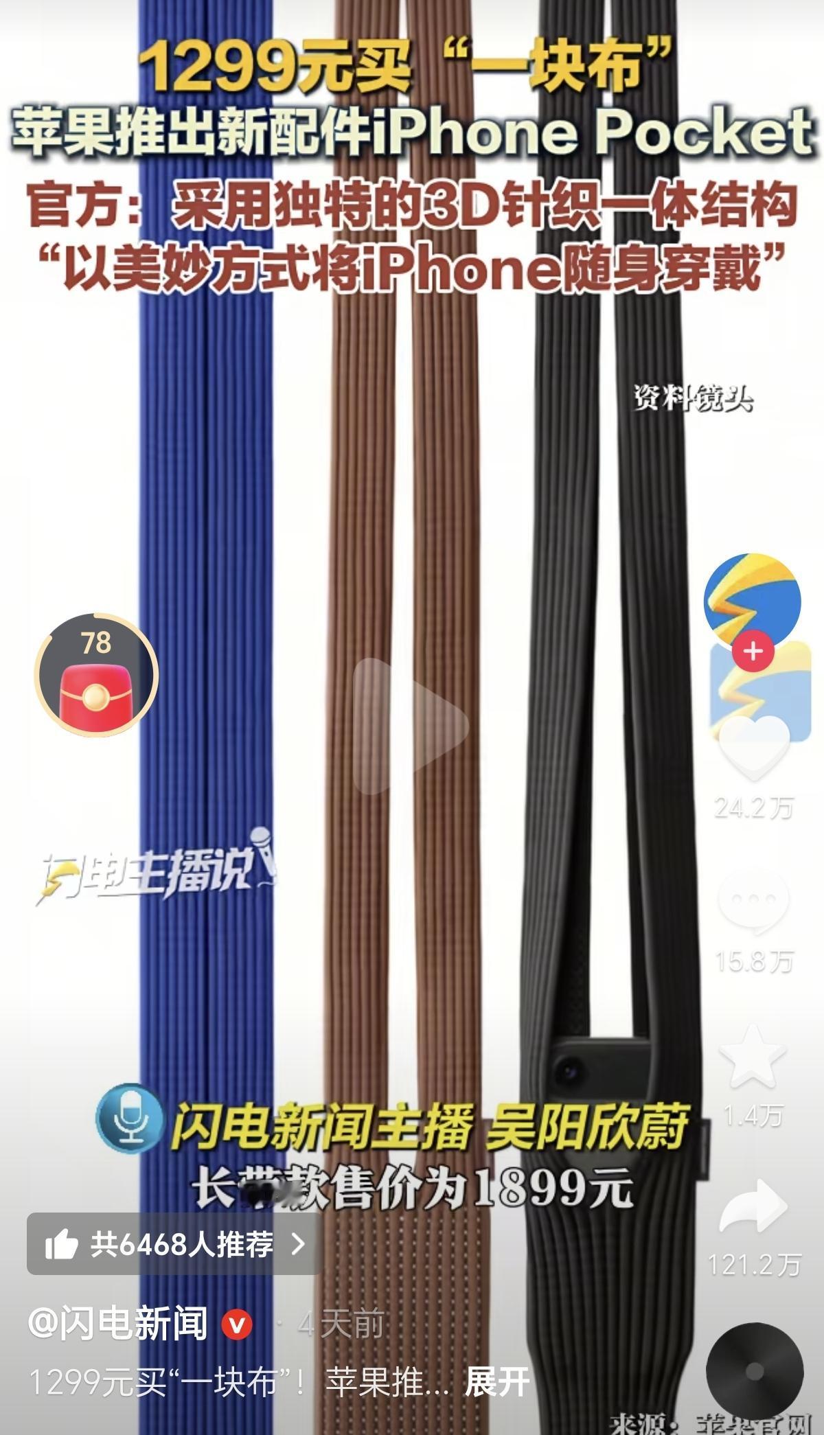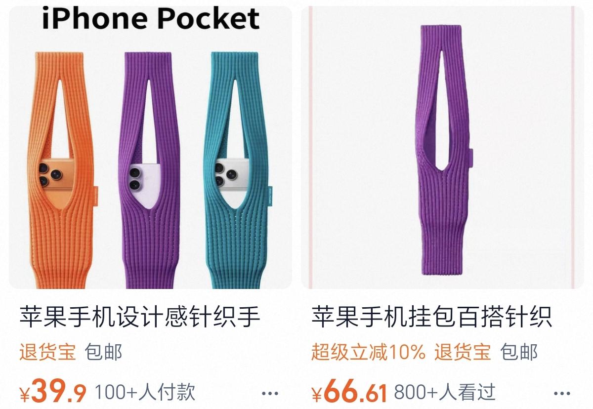 1299元,买个针织袋,装苹果手机?苹果推出了iPhone pocket,短款1299元,长款1899元。还是电商和网友有办法,一双袜子,或者自己织毛衣就可以解决。如果是机器针织的话,网上十几二十元,到几十元,也可以买到同款了。所以啊,喜欢买一千多的,就去苹果店买。想物美价廉的,自己在家用毛线球,也可以自己做一个。各取所需,互不打扰,挺好的!