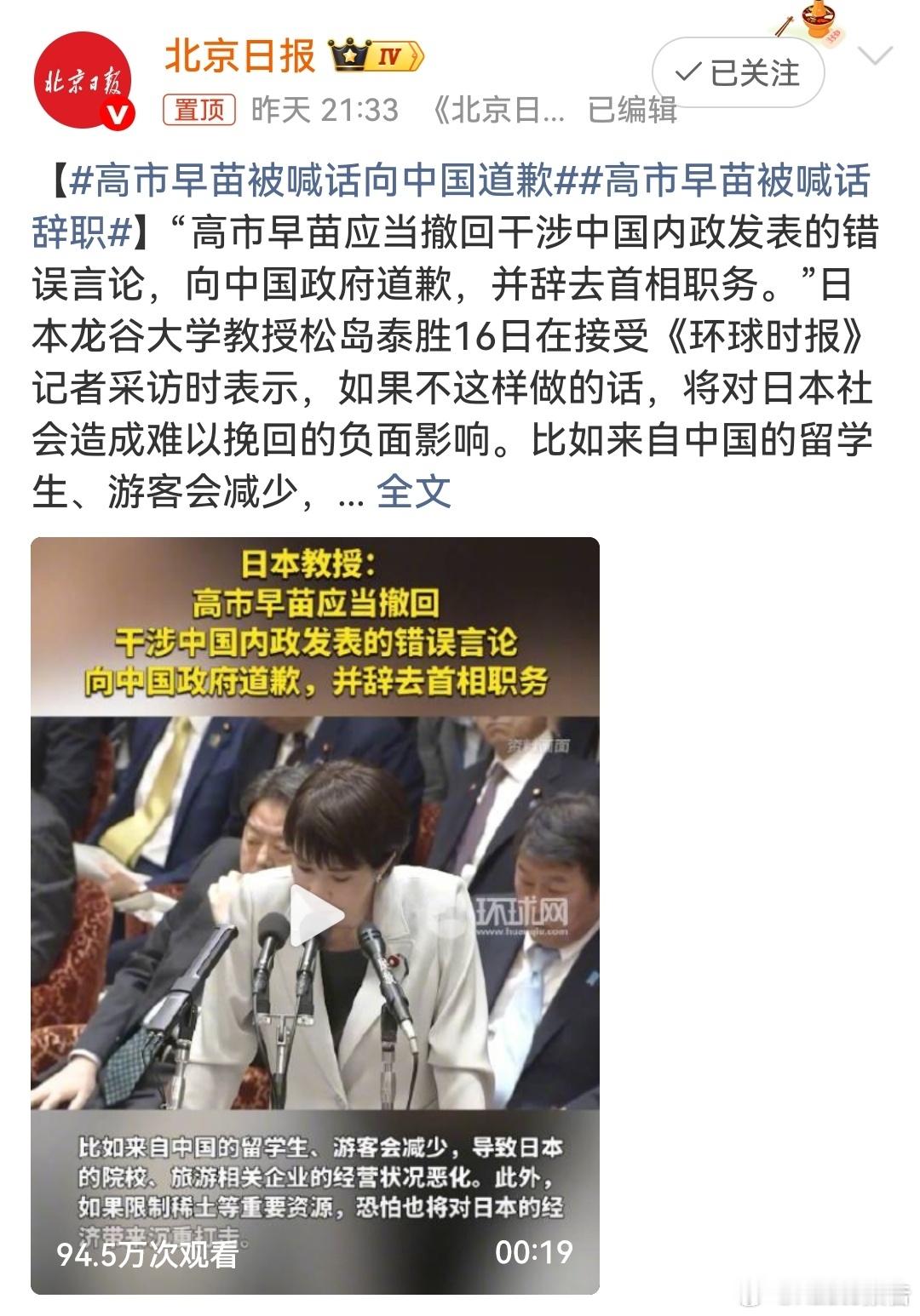 高市早苗的行径是对中国内政的粗暴干涉、对一个中国原则的公然践踏!其宣称“台湾有事”属“存亡危机事态”、暗示武力介入,违背中日政治文件精神,冲击地区和平。这种右翼激进的危险言行,既遭中日各界谴责,更需正视历史、道歉纠偏,否则必重创中日关系!