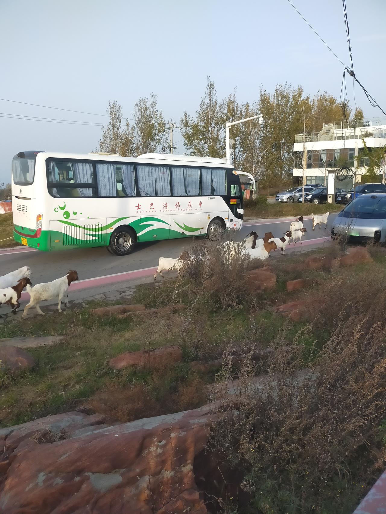 这画面也太逗了!公路上一辆印着“中原旅游巴士”的白绿大巴正开着,结果一群花山羊“大摇大摆”横穿马路,有的还在路边草坡上晃悠。旁边停着小轿车,远处是树和楼房,这城乡混搭的场景,跟“都市丽羊”逛街似的,又好笑又接地气。