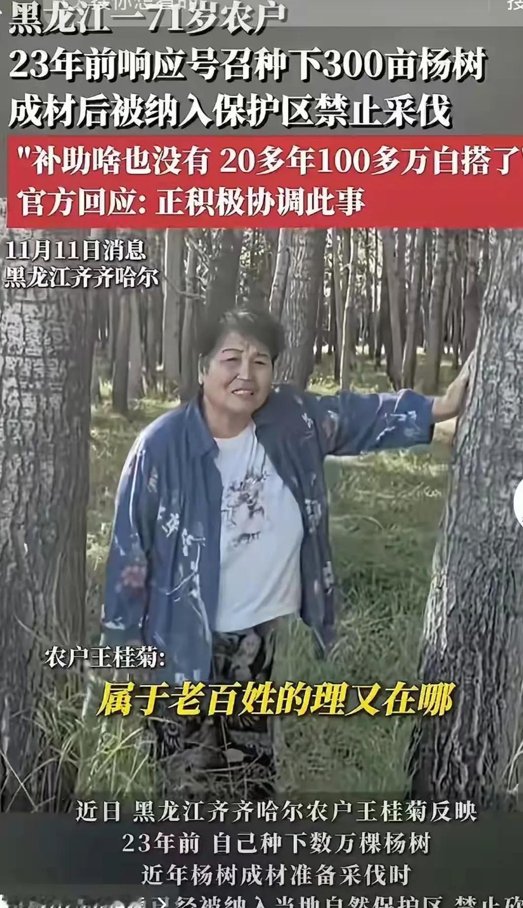黑龙江icon,71岁农户23年前响应号召种下300亩杨树icon,成材后却被纳入保护区禁止采伐,一分补助也没有给农户!农户:“上哪里说理去!我20多年的投入,100多万白搭了!”官方回应:正积极协调此事! 黑龙江的这位71岁农户,23年前响应国家号召,毅然决然地在自己那片土地上种下了300亩杨树。那时的他,满怀希望,想着通过努力改变生活,也为子孙后代留下一份希望。然而,岁月流转,杨树终于长成了参天大树,成为了村庄的骄傲,也成为了他20多年的心血结晶。 然而,令人心碎的是,成材的杨树,却因为被划入保护区,成为了“禁伐区”。这意味着,他投入的所有心血和资金,竟然变成了“白搭”。一分钱补助都没有,甚至连采伐的可能都被剥夺了。那位农户愤怒地说:“我20多年的投入,100多万白搭了!上哪里说理去?我辛辛苦苦几十年,换来的竟是这样的结果?” 这样的故事,似乎并不孤单。它折射出的是一个社会的深层次问题:在追求生态保护的名义下,普通农户的权益何在?他们的辛苦和投入,是否被合理对待?更重要的是,政府的“积极协调”是否真的能解决问题,还是又一次“纸上谈兵”? 我们不得不反思:在保护生态环境的同时,是否也要考虑到那些默默耕耘、为土地奉献多年的普通人?他们的付出,难道就只能成为“牺牲品”?还是说,真正的保护,是要让每一个为土地付出的人都能感受到公平和尊重? 这不仅仅是一个个体的悲剧,更是一面镜子,映照出我们社会在快速发展中的某些盲点。我们追求绿色、追求可持续发展,但是否也要建立起一套更为科学、合理的补偿机制?让那些为环保付出的人,不再是“无声的牺牲者”。 或许,这位71岁的农户,只是众多被“保护”却被忽视的农民之一。每一份土地的付出,都值得被尊重,每一份努力都应得到合理的回报。希望在未来的日子里,我们能看到更多的公平与温暖,让那些曾经为了生态环境默默奉献的人们,真正感受到社会的关怀和尊重。 这场看似“保护”的行动,究竟是“守护”还是“剥夺”?让我们拭目以待,也希望这位农户的故事,能引发更多人的思考——在追求美丽中国的路上,我们是否也在守护着那些最朴实、最真诚的付出?杨树树 无絮杨树 杨树种植