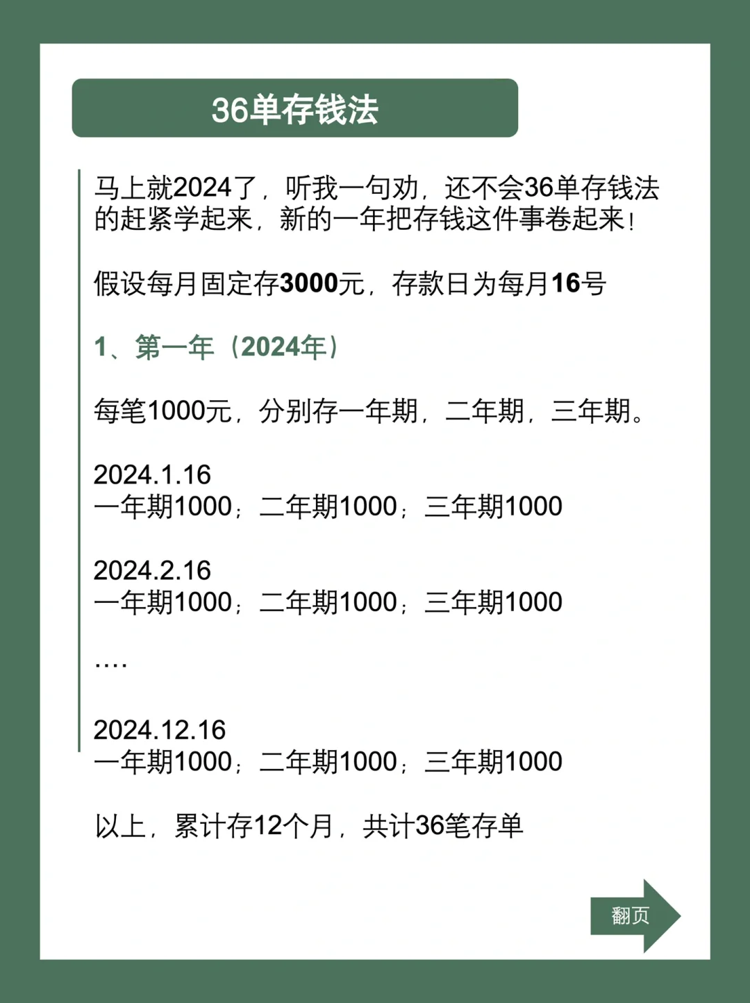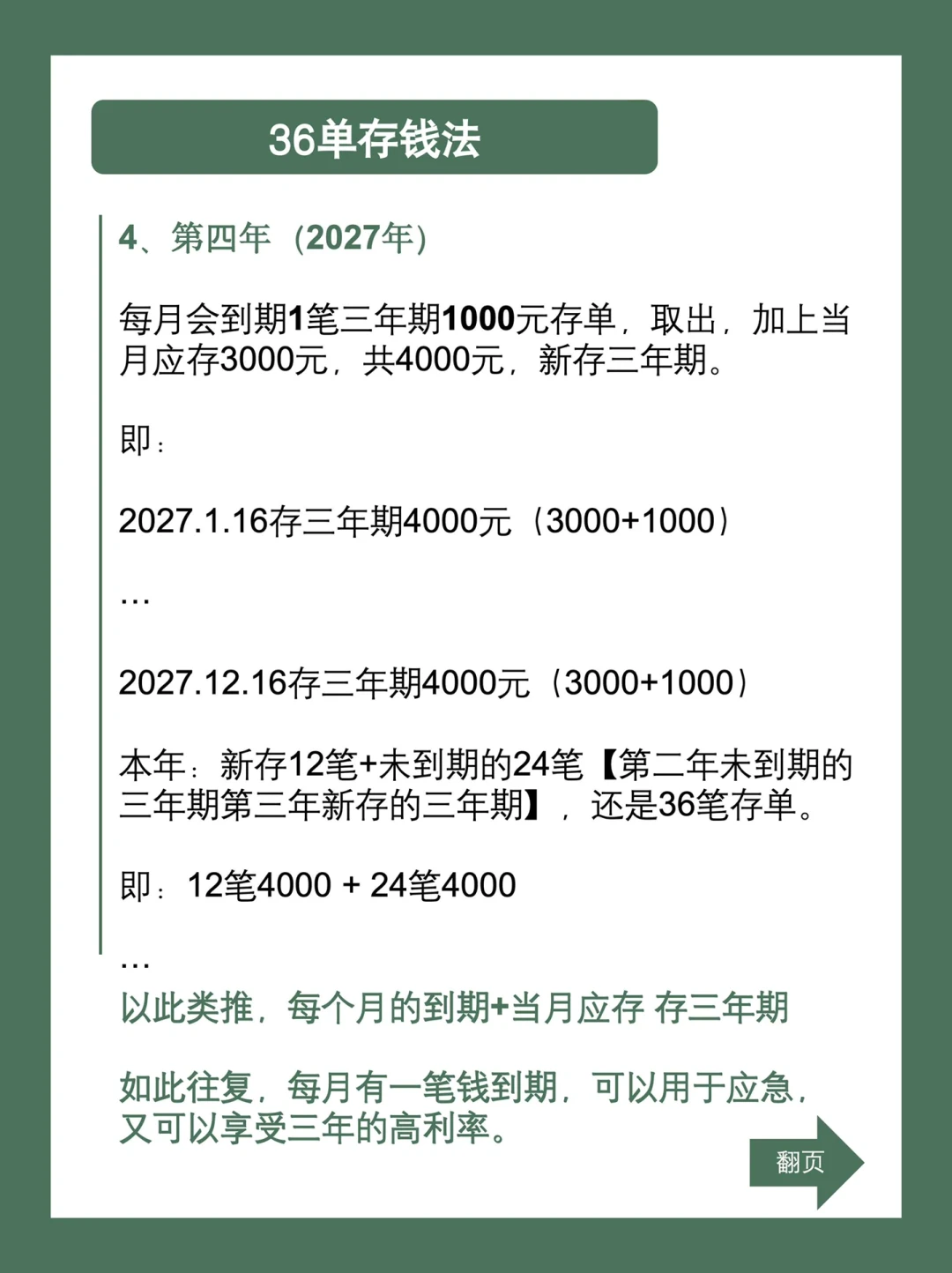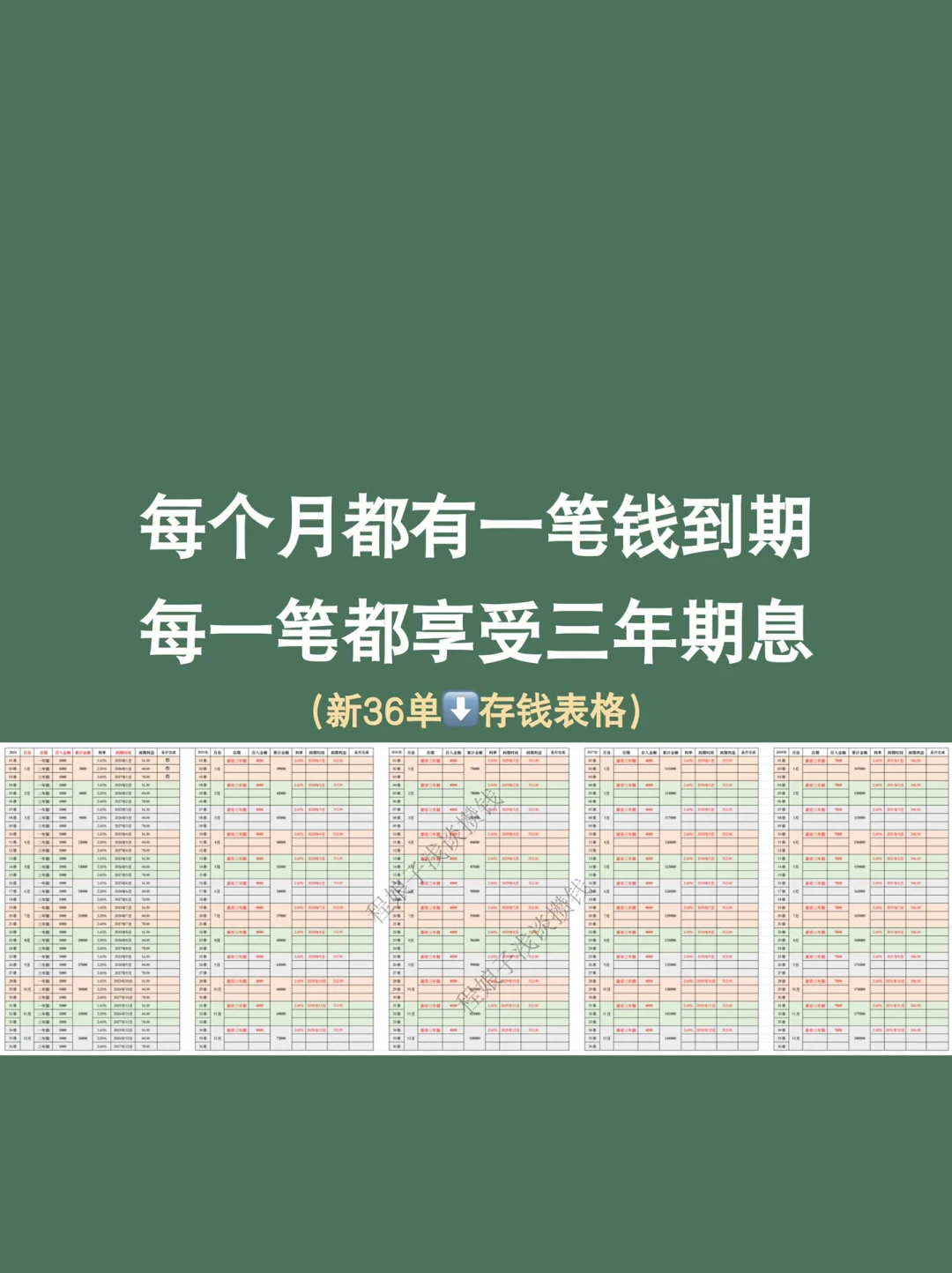 36单存钱法的好处,每个月都有一笔钱到期,有一笔利息收入,方便灵活用钱,蕞重要的是每张存单都享受到三年期好利,这样存钱存款会越来越多,利 还滚利。