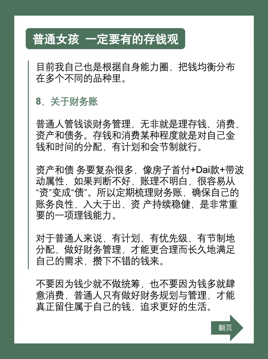 普通人谈钱论财务管理,无非理存钱、消费、资产和债 务。存钱和消费某种程度是对自己金钱和时间的分配,资产和债 务要复杂很多,像房子首付+Dai款+带波动属性这种,很容易从资变成债。定期梳理财务账,控好资债,入大于出,维持良性很重要。普通人做好财务规划与管理,不因为钱少不做统筹,也不因钱多就肆意消费,才能真正留住属于自己的钱。