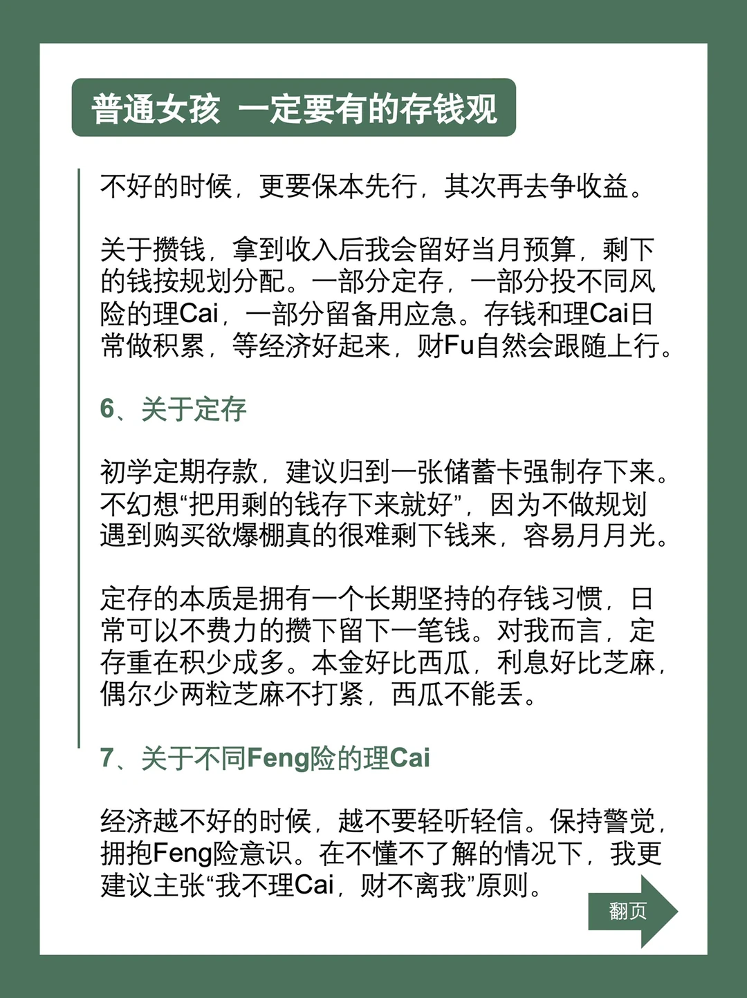 初学定期存款,建议归到一张储蓄卡强制存下来。不幻想“把用剩的钱存下来就好”,因为不做规划,遇到购买欲爆棚真的很难剩下钱来,容易月月光。定存的本质是拥有一个长期坚持的存钱习惯,不费力的攒下留下一笔钱,利息只是附带。