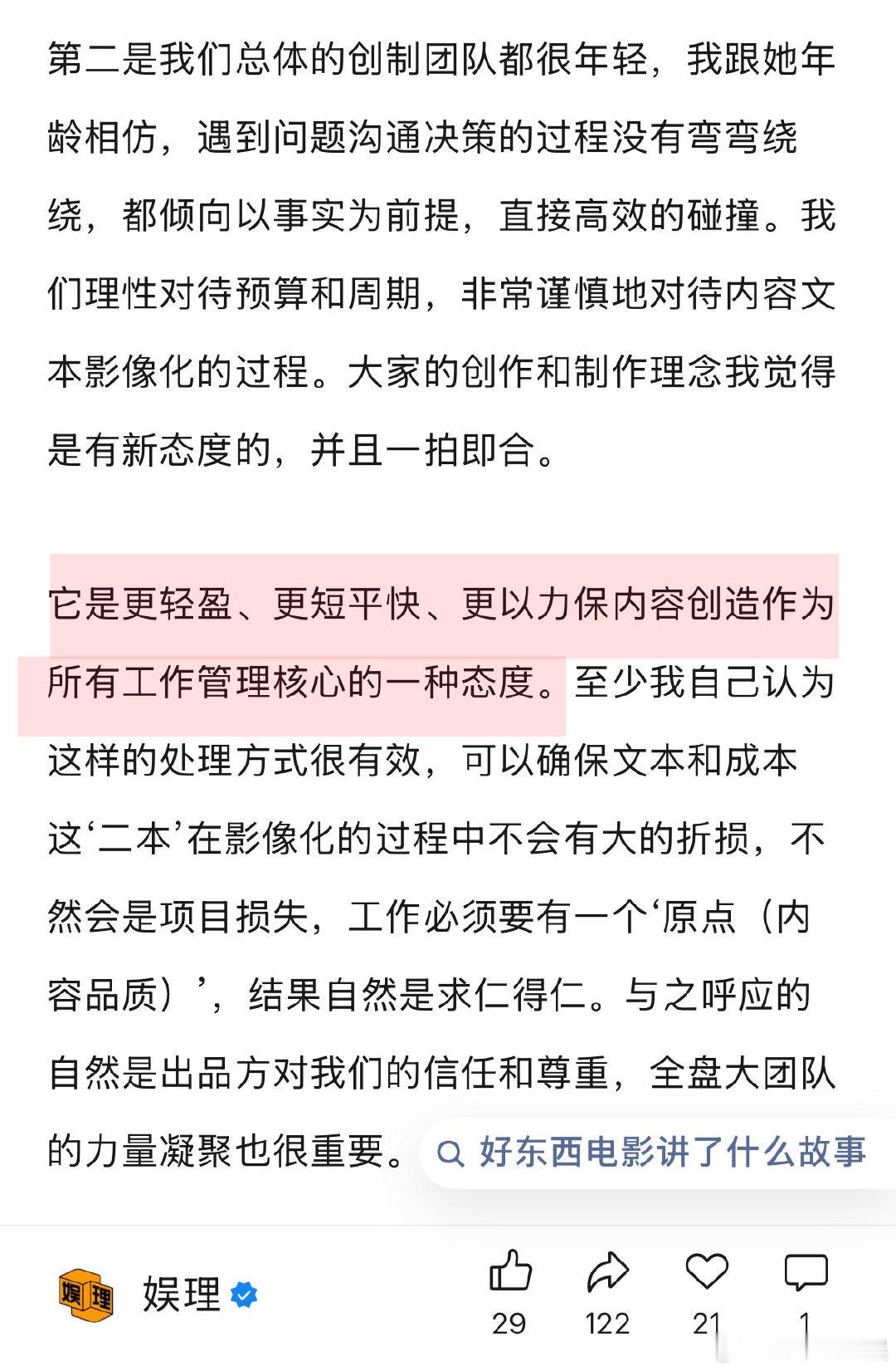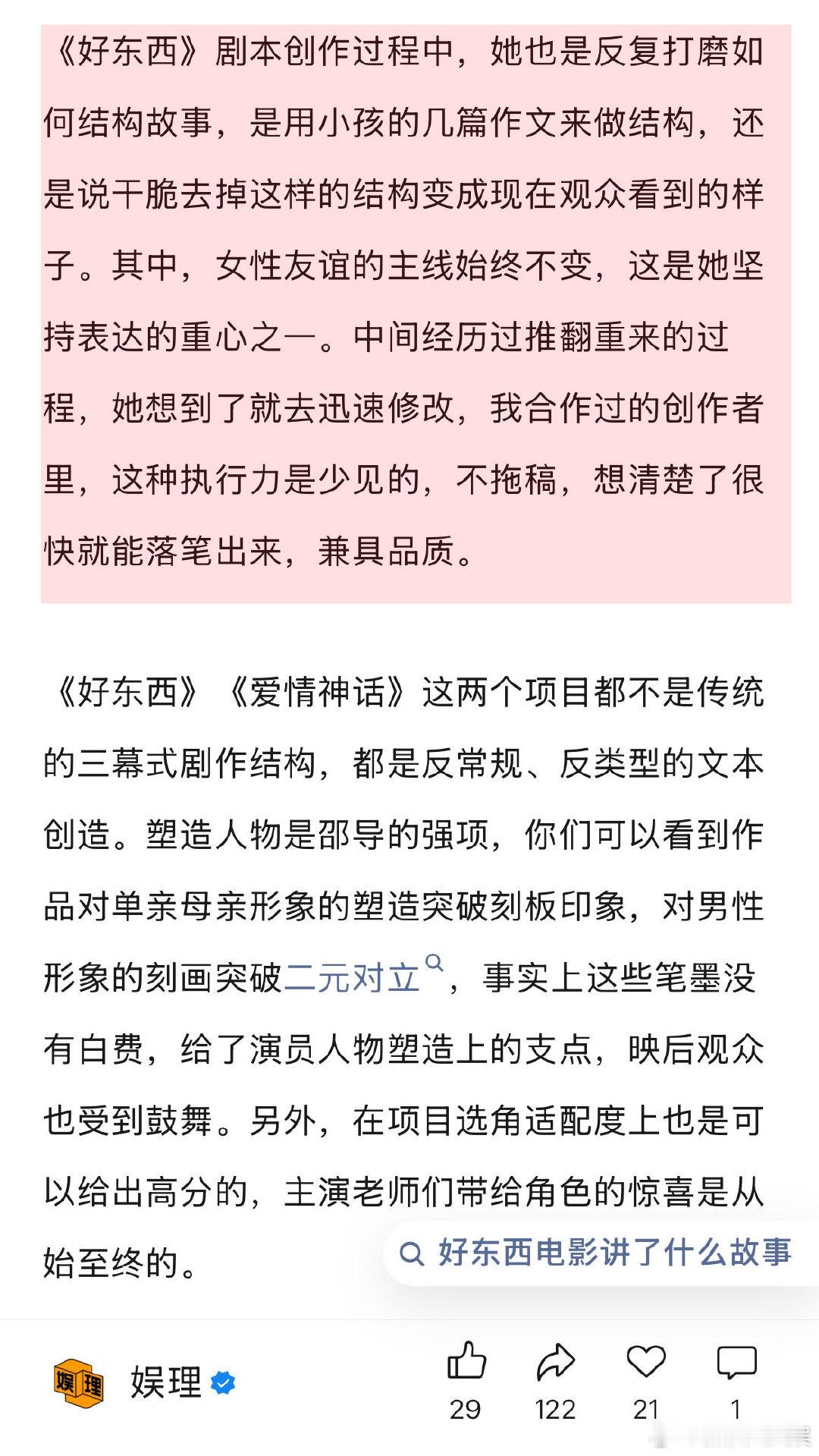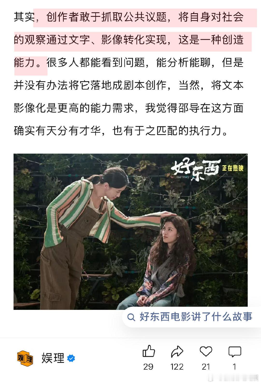 《好东西》《爱情神话》制片人叶婷谈及邵艺辉时,直言对方的原创能力非常强,“她是一个作者向的创作者,很难单一用职业编剧、职业导演等身份去定义,有别于'定制生产'型的工作模式。她擅长观察与捕捉,有能力将自身对于当下社会的思考观察与生命体验相结合,并且转化落定为文字,最终完成影像化表达。这本身就具有稀缺性。”↓
