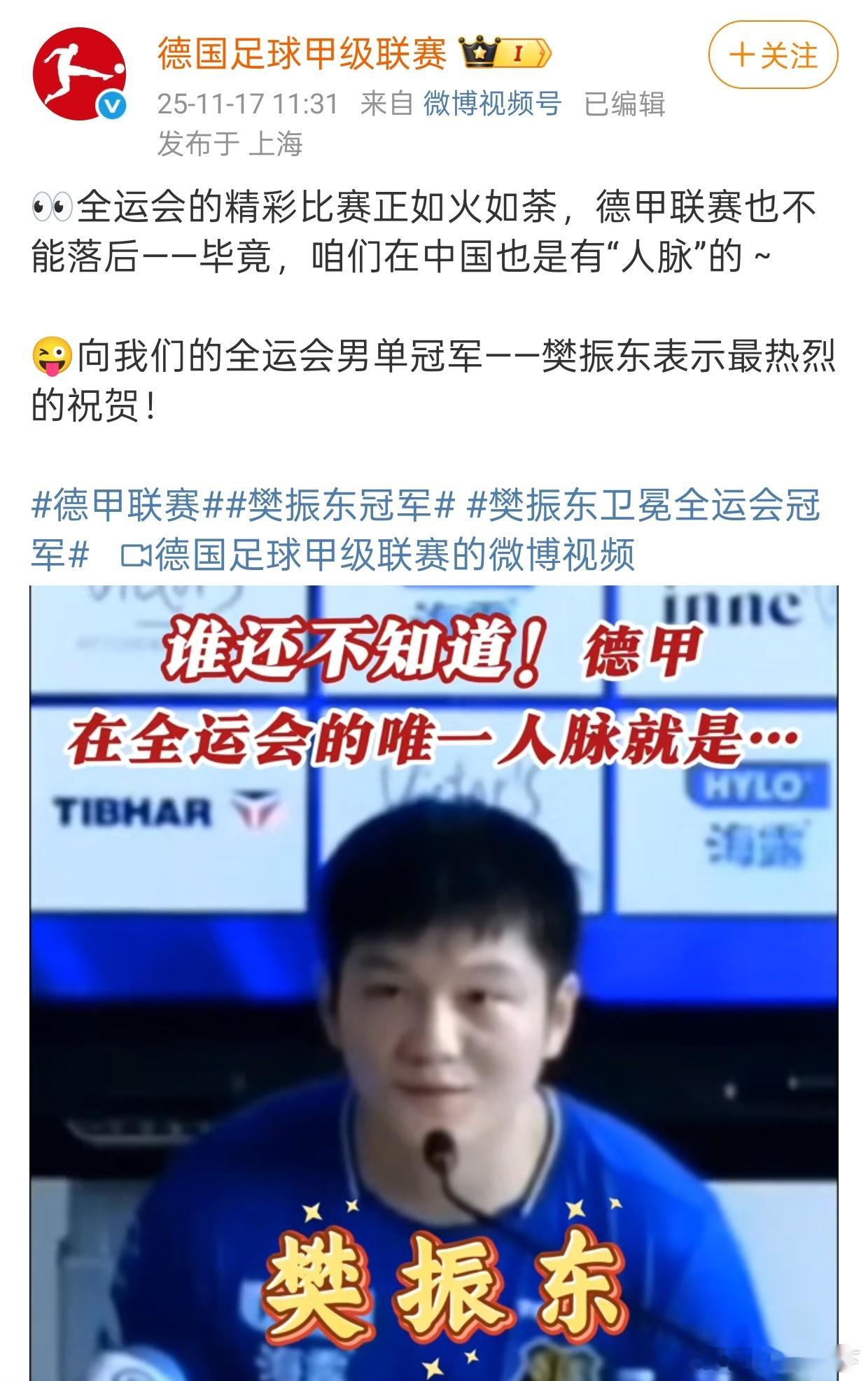 德甲足球联赛祝贺樊振东夺冠🎉德甲足球联赛太可爱了🥰称樊振东是德甲联赛在中国唯一的“人脉”全世界都在喜欢着关注着樊振东。