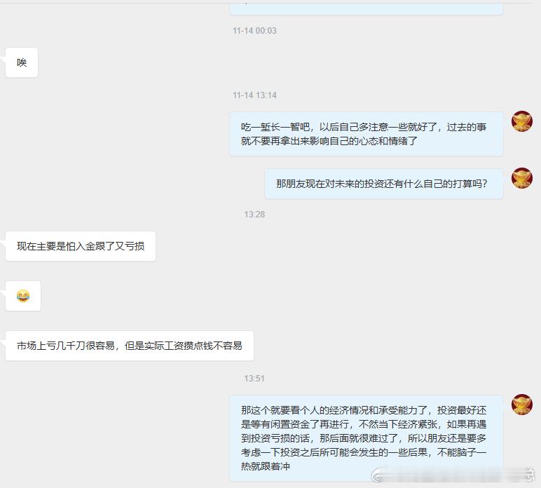 但我们在这条路上前行时,一定要切记不能本末倒置。投资一定要从自身实际情况出发,合理规划,绝不能抱有赌徒心态。这条路上诱惑与不确定性交织,也有形形色色的“老师”和观点,需要我们沉下心来、仔细辨别和观察,切忌冲动行事。正如私信里这位朋友所说,亏掉几千美金很容易,赚钱却并不简单。因此,在决定是否踏入投资领域之前,一定要先审视自己的情况,不要贸然进场。毕竟,投资这条路上成功者终究是少数,大多数人难免成为被收割的对象。你适不适合尝试投资,也要根据自身的资金状况来安排。务必先保障基本生活不受影响,并预留好应对家庭急用的资金。把这些都安排妥当之后,再用剩余的闲钱去做投资。这样一来,你才不会有过重的心理负担,心态也能更加平稳,从而以更从容的状态面对涨跌盈亏,真正做到理性看待得失。如果你现在生活不是很宽裕的情况,我建议不要去挑战风险高的投资项目,一定要结合自身情况重要的事强调三遍!!!!非要尝试投资的话,可以找一些稳健些的低风险投资或者理财产品。平时工作繁忙,有时候回复未必及时,表达也可能不够周全,还请大家见谅。今天这位朋友的私信,让我想起一位老朋友。她本身就大手大脚也不太注重储蓄,加上不安于现状,竟在没弄清产品详情的情况下,就借钱、套现信用卡去投资,结果血本无归。最终,她不仅被银行催款,欠下人情债,生活也陷入困境。这无疑是一个我们必须警惕的反面教材。虽然私信的朋友情况不同,但我还是想借此提醒一下大家:投资路上务必保持清醒,凡事三思而后行,结合自己情况来。大家赚钱都不容易,我们唯有谨慎,方能行稳致远。