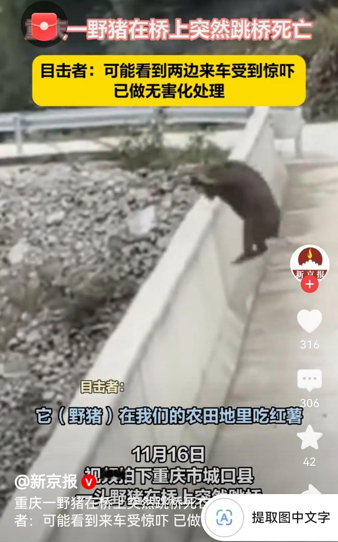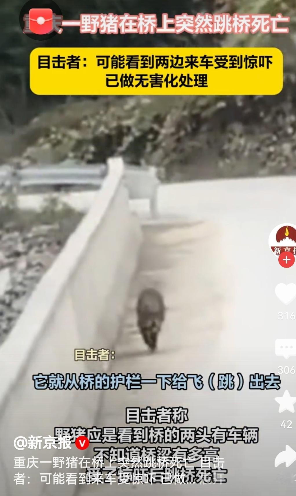 重庆一野猪在桥上跳桥死亡这只野猪受惊吓跳桥太让人心疼了,也能看出现在生态好了野生动物才会频繁出现。希望后续能有更合理的措施,既保护动物也避免类似意外,愿小生命安息~[烟花][烟花][烟花] 野猪事故 评论打卡任务