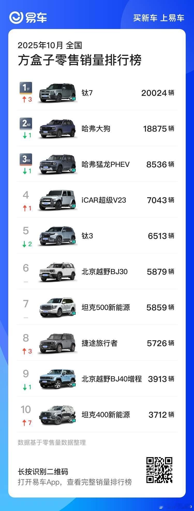 十月方盒子销量,数据来源乘联会钛7毫无悬念,毕竟承托起了方程豹哈佛的狗和猛龙PHEV还是很猛,意外的是icar V23居然月销有7K+ 如果V27定价合理,icar品牌算是找到了自己的方向了。大货过后的捷途旅行者归于平淡,看来势必要大改款才行