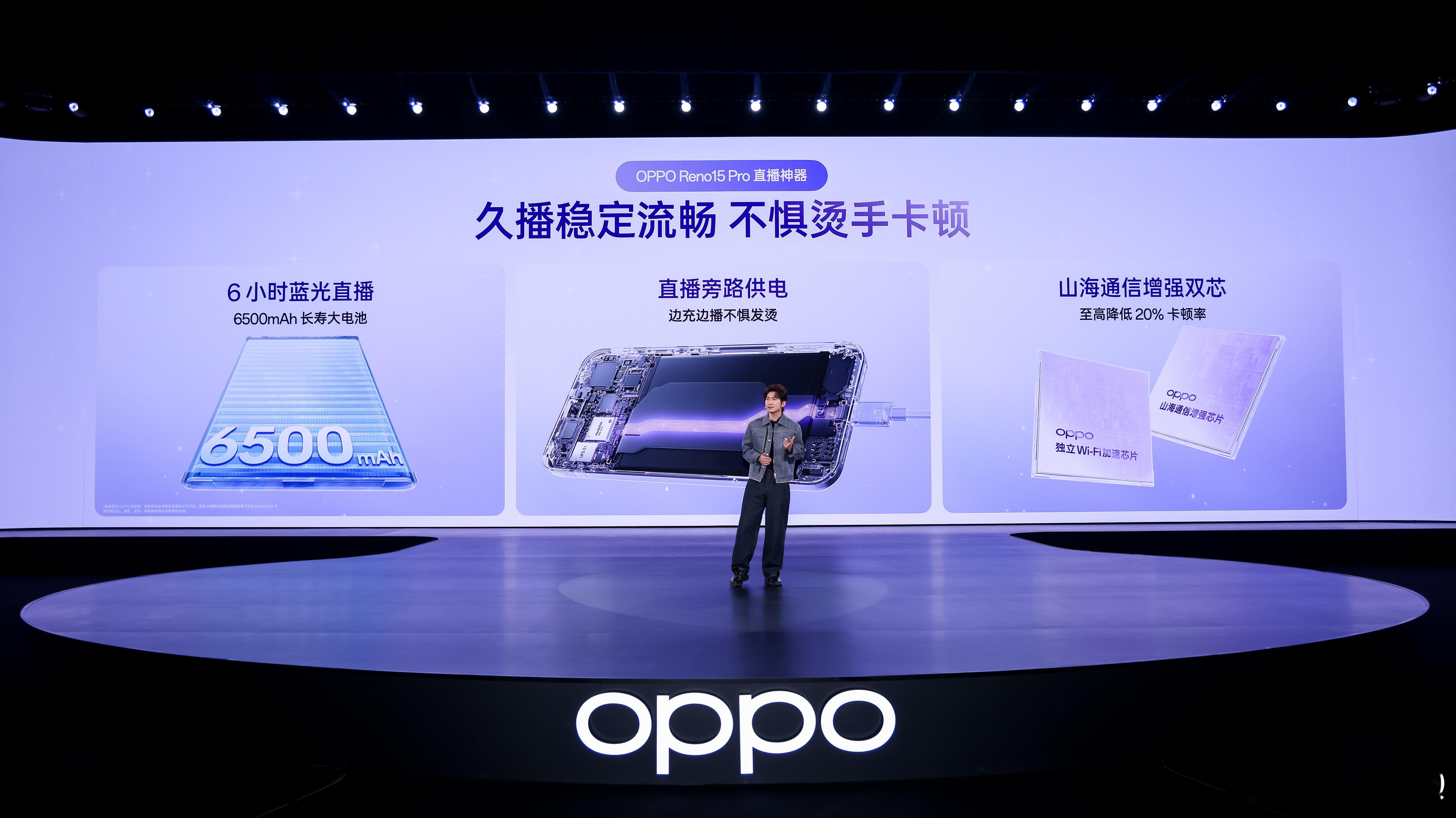 看看OPPO Reno15 Pro的直播能力!超稳的2亿像素超清主摄,超广视角前置镜头,直播也有了和照片、实况、视频一脉相承的超清体验。优化了三麦克风降噪的算法。能够在漫展、户外旅行、探店走播时,有效降低背景噪声,可以随时随地轻松开播 ,人声再远也字字清晰。超大电量的长寿电池,搭配自研的山海通信增强双芯,不插电也能保证6小时的蓝光超清直播稳稳在线,此外,Reno15 Pro 提供了直播旁路供电,边充边播,也不怕烫手和卡顿。还有AI直播高光切片...6不6