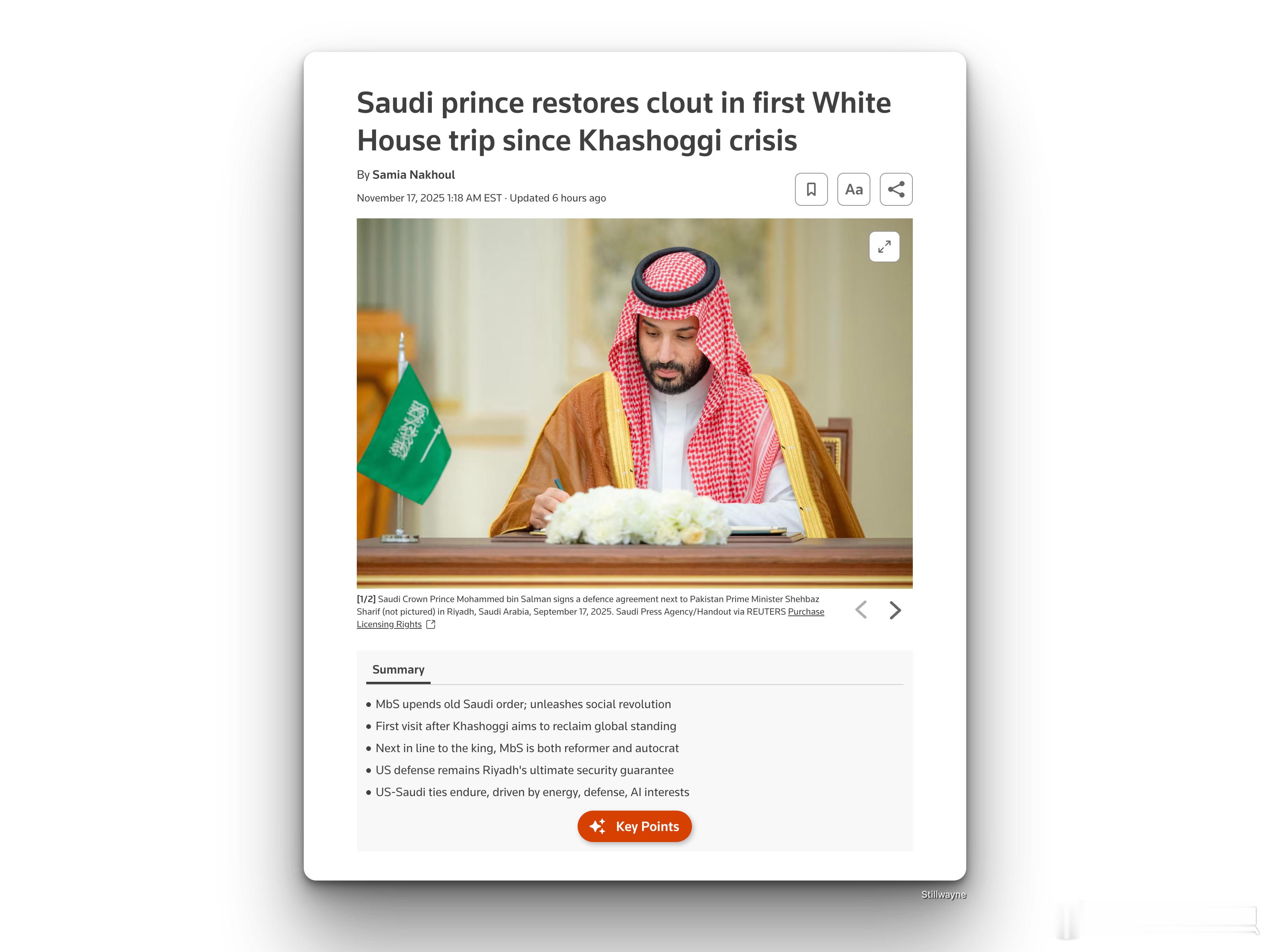 自“肢解卡舒吉”事件以来,沙特王储首次访问白宫自沙特批评人士卡舒吉遇害引发全球愤怒以来,王储穆罕默德·本·萨勒曼首次访问白宫,此行的目的是重振其在世界舞台上的地位,并向特朗普证明,支持他是值得的。萨勒曼既是改革者又是独裁者,他已成为沙特王国现代史上最重要、最大胆的领导人。萨勒曼解除了曾经令人闻风丧胆的宗教警察的权力,边缘化了神职人员,并废除了数十年来严苛的社会规范。如今,女性可以开车、工作,并与男性自由交往,这些在过去都会被处以鞭刑。但正是这只开启了沙特社会世俗化的手,如今却收紧了权力。异议遭到镇压,批评者被噤声,竞争对手的权力中心被封锁和瓦解。信息很明确:改革只能按照穆罕默德·本·萨勒曼的条件进行,而对他的忠诚就是需要付出的代价。