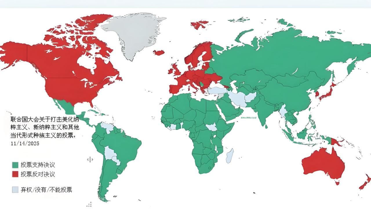《打击美化纳粹主义、新纳粹主义及其他助长当代种族主义、种族歧视、仇外心理和相关不容忍行为的做法》,当地时间2025年11月17日在联合国大会第三委员会以记录表决方式通过。 这项决议由俄罗斯等国每年提出,已成为联合国大会的年度议题,自2005年以来连续提交。 根据联合国官方记录和多家媒体报道,本次投票结果如下: 赞成:119票。包括中国、白俄罗斯、巴西、俄罗斯、印度、南非等发展中国家和部分新兴经济体。 反对:53票。主要为西方国家,包括美国、加拿大、德国、意大利、日本、法国、英国、澳大利亚、乌克兰、波兰、芬兰等。 弃权:10票。包括一些中立或摇摆国家,如挪威等部分北欧-波罗的海国家集团。 这项决议的通过标志着全球多数国家对打击纳粹主义及其现代变种的支持,但也凸显了地缘政治分歧:反对票几乎全部来自欧美国家联盟,即北约成员国和盟友。 决议虽通过,但不具法律约束力,主要呼吁各国加强教育、立法打击仇恨言论如欧盟的《数字服务法》已部分响应。俄罗斯视其为“道德胜利”,而西方国家则通过平行决议如2023年欧盟推动的反极端主义框架回应。