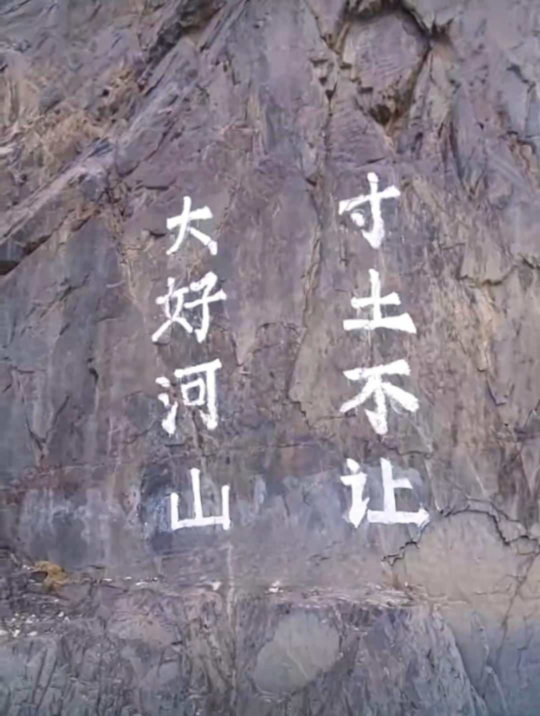“大好河山,寸土不让”写在中印边境加勒万河谷的崖壁上。 看似简单的八个字,却重若千斤,含金量可见一斑。 祁发宝团长命令马志忠书写,表达了中国对领土完整坚定立场和坚强斗志。🙏