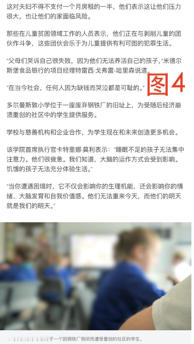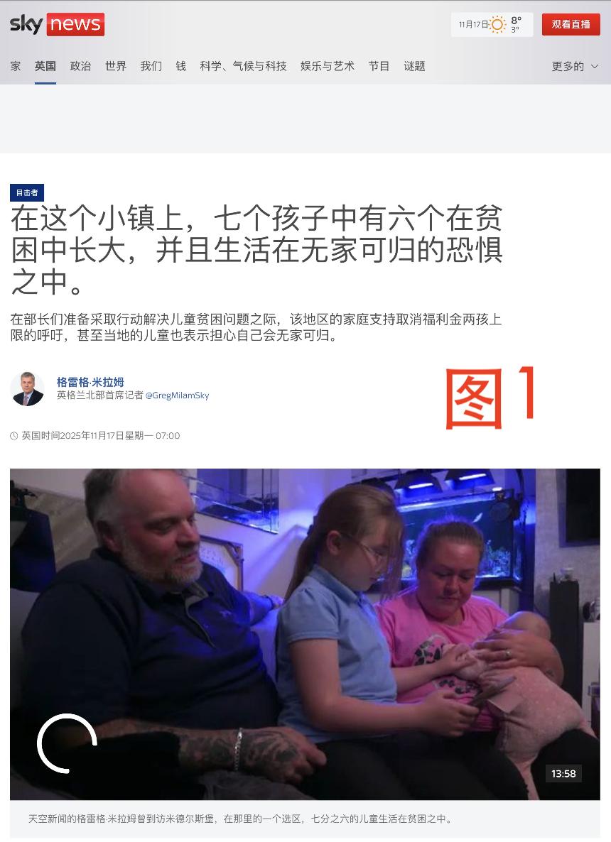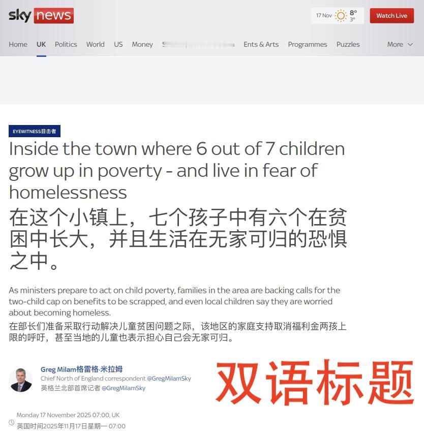 31%的英国儿童生活在贫困之中,这是英国儿童贫困行动组织网站上公布的数据,更具体的描述是“截止2024 年4月的一年中,英国有450万儿童生活在贫困之中,比上一年增加了10万。这意味着英国有31%的儿童生活在贫困之中。” 然后,英国天空新闻在11月17日发表文章,题目是《在这个小镇上,七个孩子中有六个在贫困中长大,并且生活在无家可归的恐惧之中》。 大约一年前,我在直播里说英国有超过200万儿童生活在贫困中,然后被一位网友厉声责骂,说我无耻地造谣。而我当时连反击的勇气都没有,因为我的确没有在英国挨家挨户地调查实际情况,并且也知道英国媒体经常撒谎。 现在,我把天空新闻刚发表的文章以截图方式呈现出来,不过这可能导致另一种风险——有人会质疑说:“为什么英国网站都是中文。”