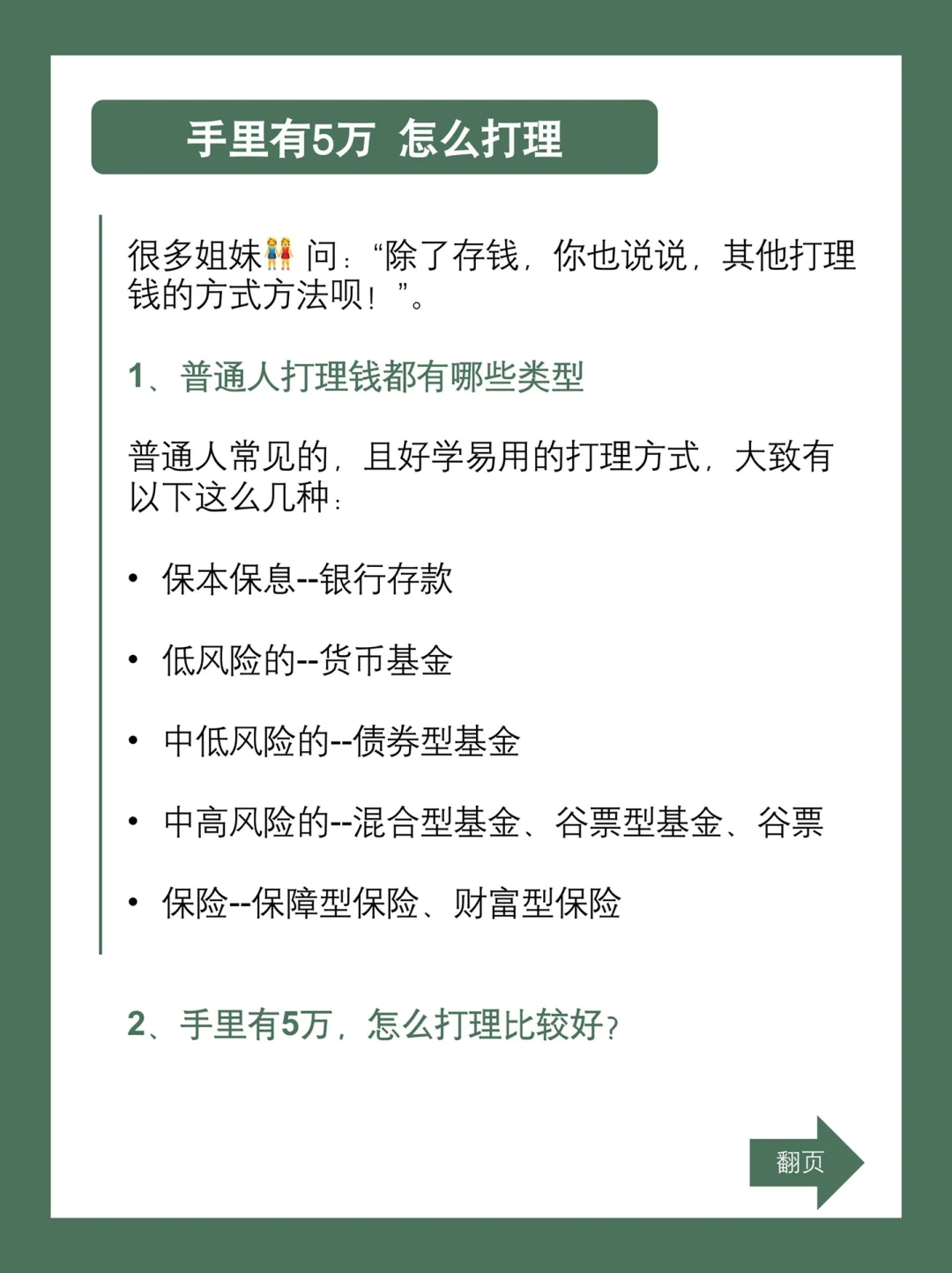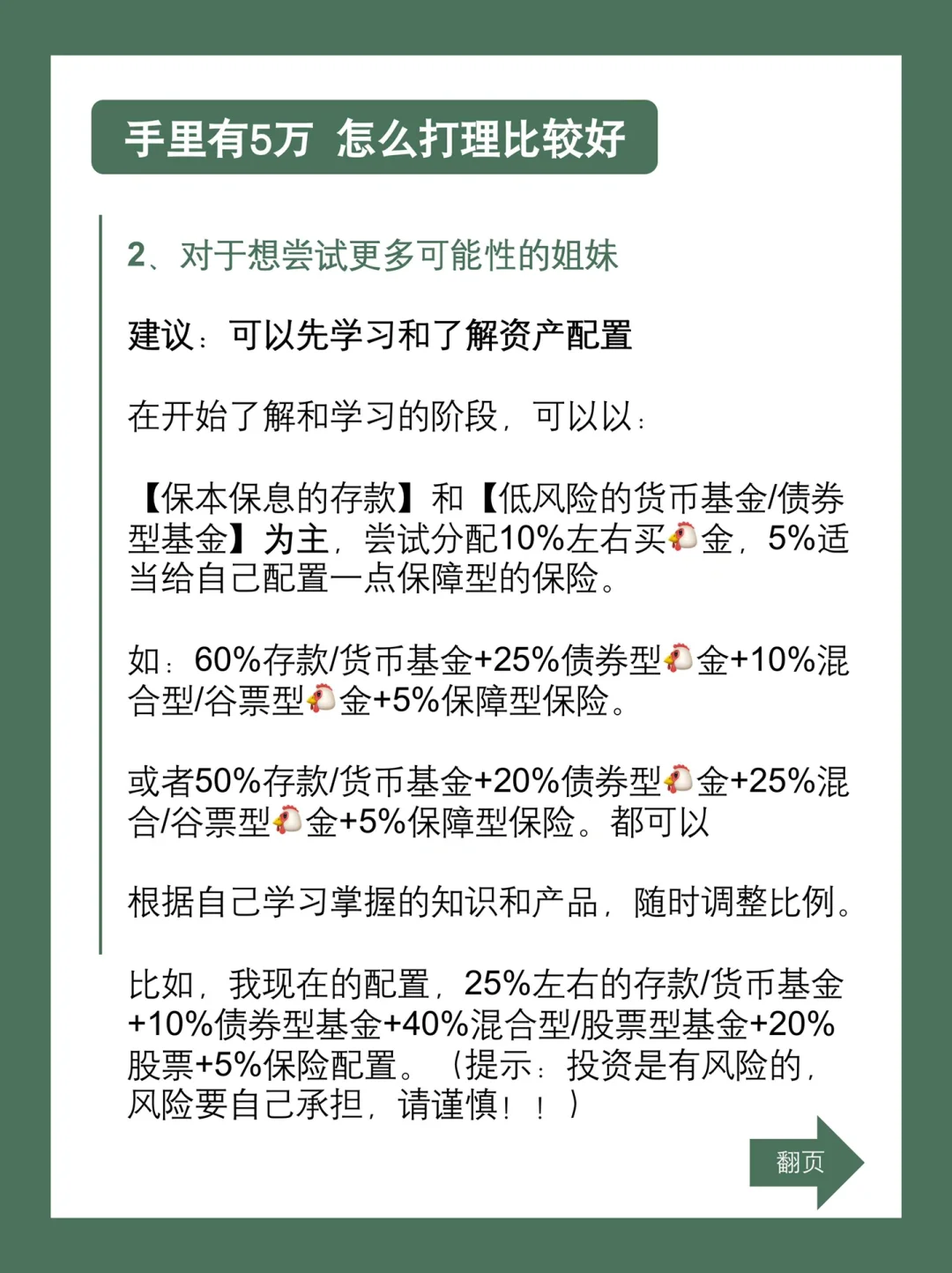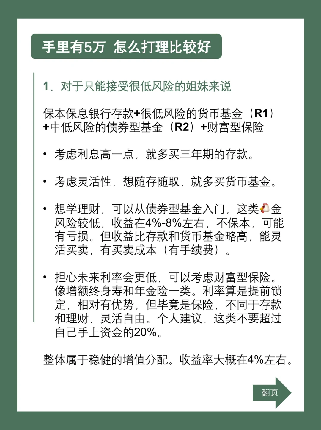 可以关注:保本保息银行存款+很低风险的货币基金(R1)+中低风险的债券型基金(R2)+财富型保险