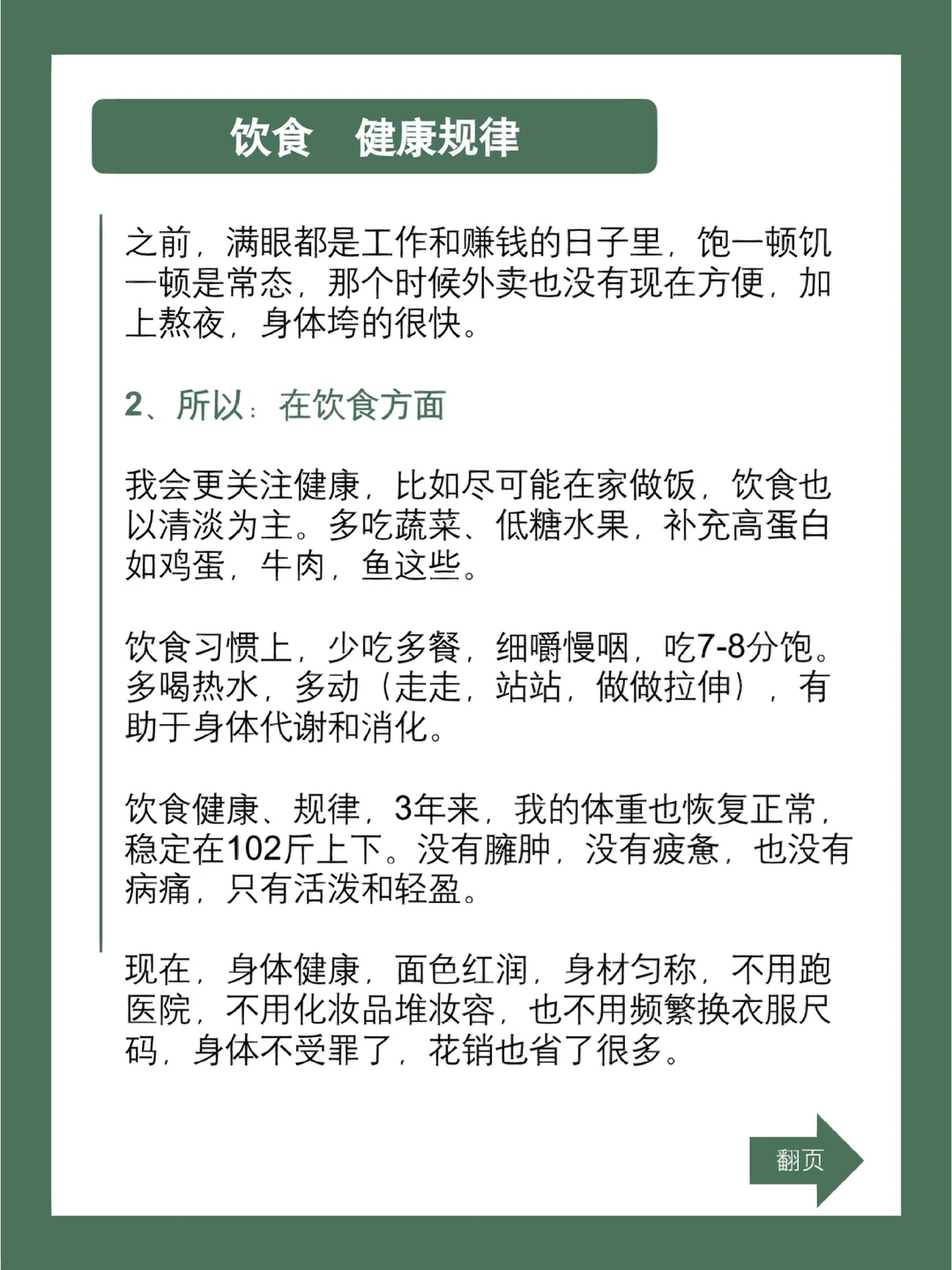 喜欢清淡、健康、规律的饮食。日常也是尽量自己做,多吃蔬菜,低糖水果,补充高蛋白。饮食习惯上,注重少吃多餐,细嚼慢咽,吃7-8分饱。日常多喝水,多运动,促进消化代谢。可能是经历过亚健康,所以对好的身体和体态,会格外在意。好的身体真的能省很多。