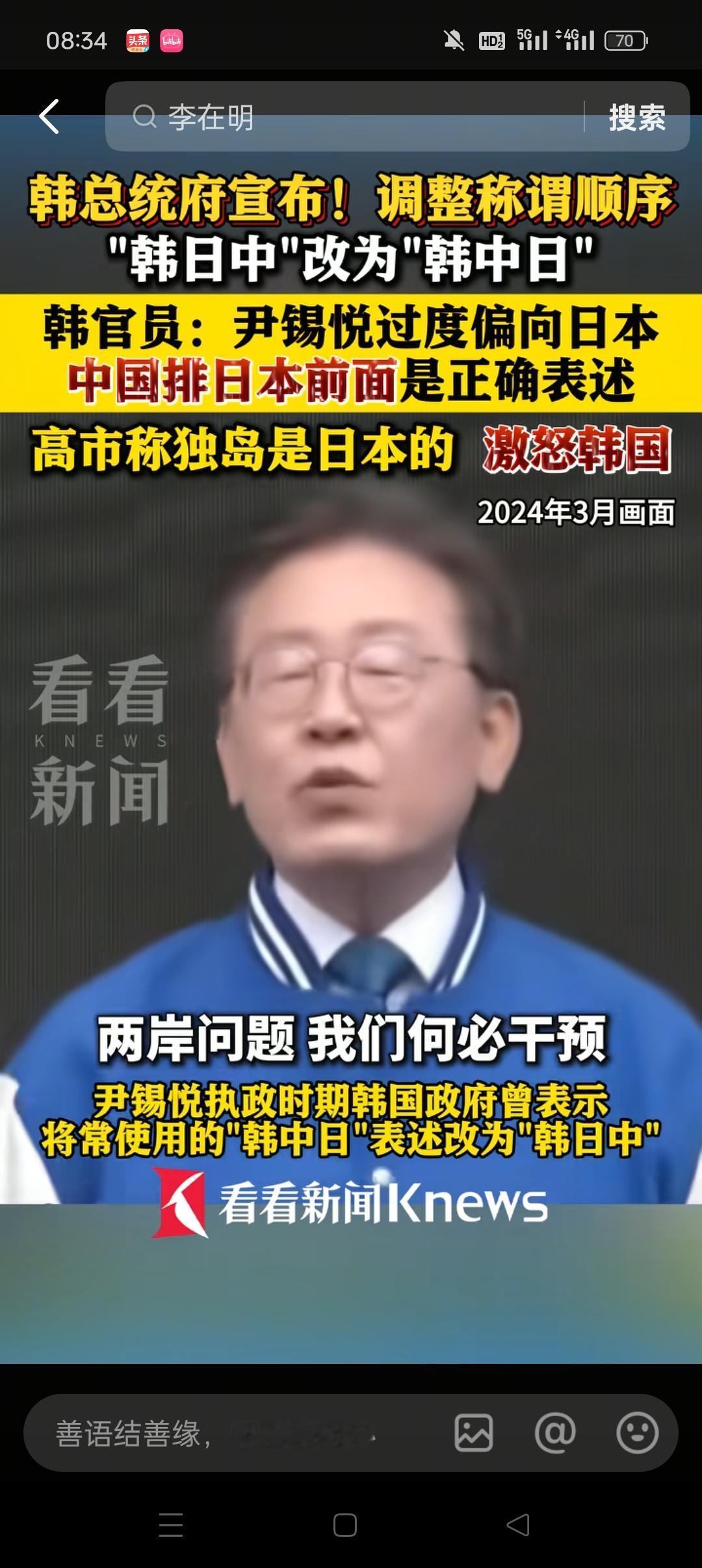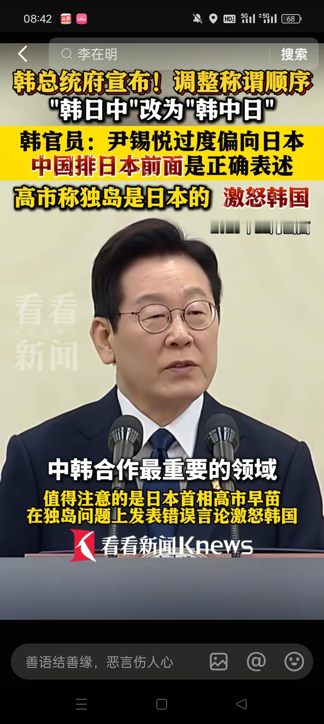 高市早苗的不正确言论不仅激怒了我们,就连将隔壁旁的韩国也给惹怒了,因为高市早苗的言论还涉及了韩国问题。于是,韩国表达了自己对日本的强烈不满,并且韩国总统接着向世界公布了他们新的调整顺序,将以前的“韩日中”改为了“韩中日”。真的是一挑二啊!
