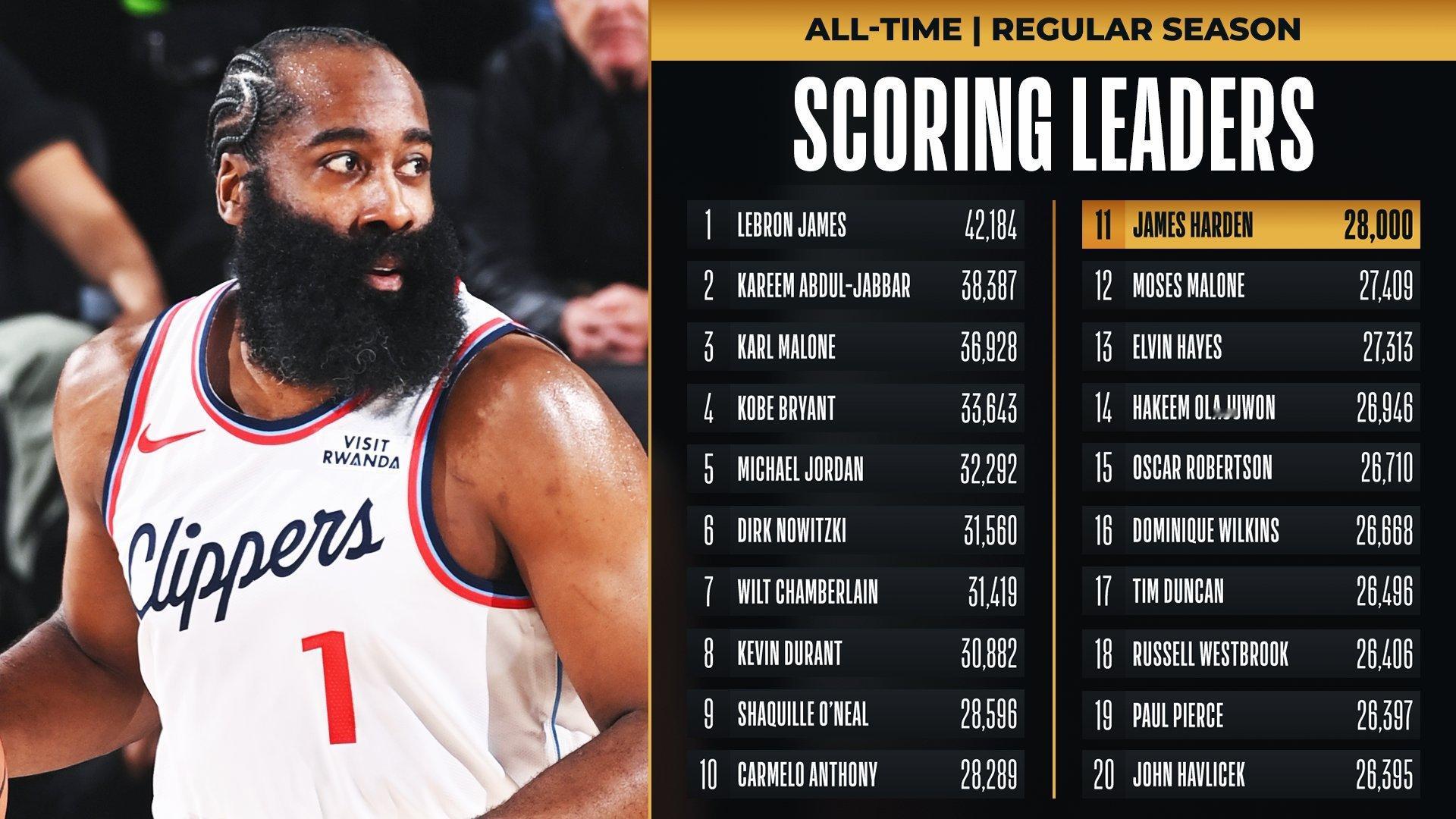 恭喜职业生涯总得分突破28000分,排名nba历史第11位。