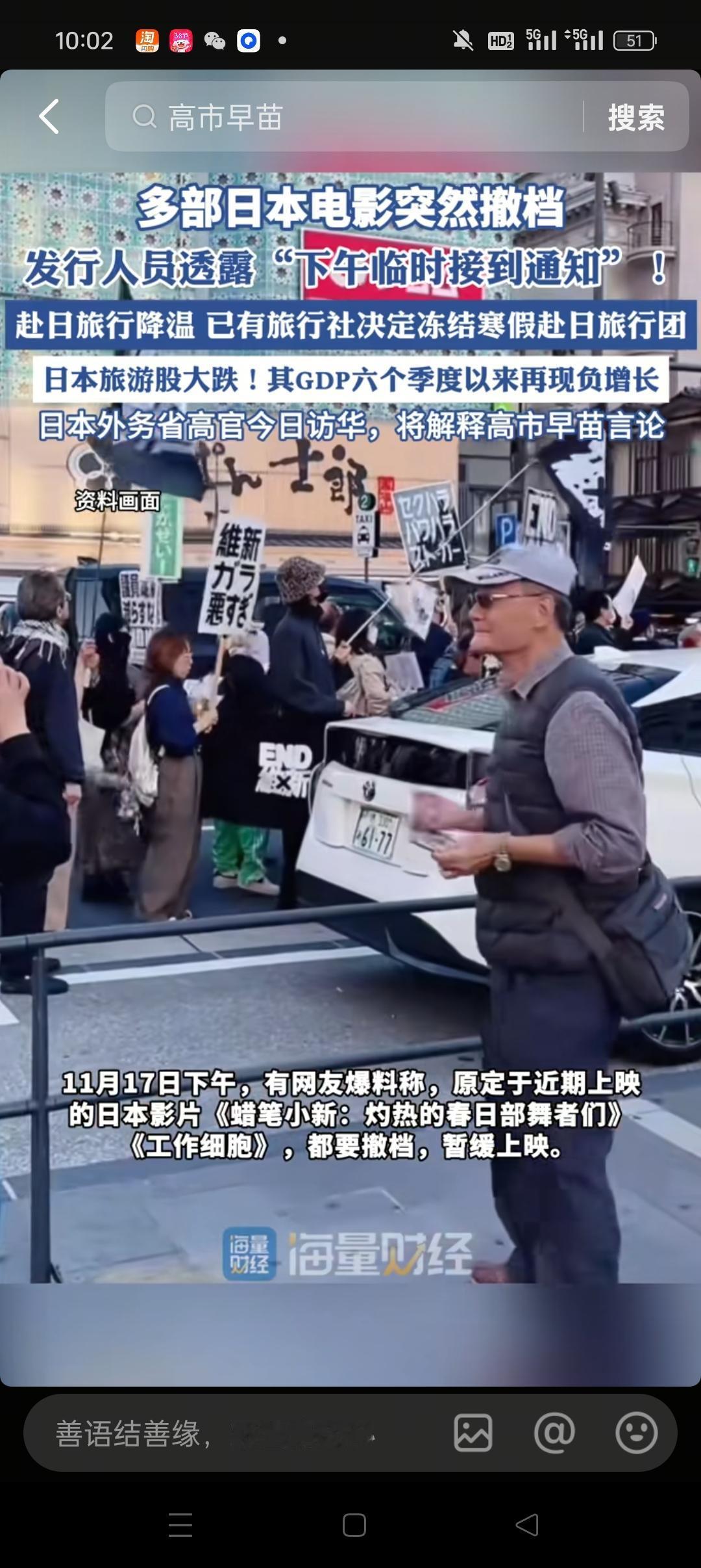 准备在中国大陆上映的多部日本电影突然全部撤档,比如新出蜡笔小新以及工作细胞这俩部电影已确定要暂缓在中国大陆上映了。这其中涉及多个方面,受高市早苗的不正确言论影响下,比较多的日本电影的票房已出现了下降,就比如最近的鬼灭之刃,刚出的时候还好,但后面就出现断崖式的下降了。